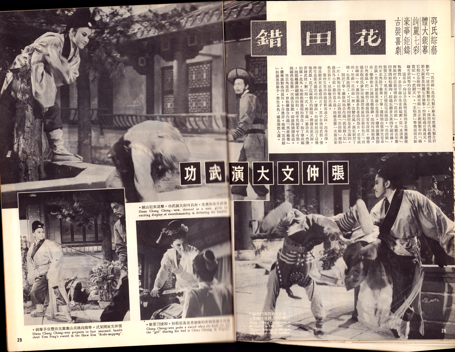 這部由一向以手法高明見稱的著名導演嚴俊執導筒,並由千面小生金銓編劇,從「水滸傳」裡取材的古裝奇情鉅片「花田錯」,是在去年第四季開始拍攝的,經過五個多月來的千錘百鍊,緊張工作,現大致已接近完成階段。「花田錯」的女主角除了樂蒂、丁寧,還特別由張仲文客串主演,男主角則是英俊小生喬莊。據導演嚴俊指出:樂蒂在本片演的是個慧婢,她的玲瓏剔透,過去在邵氏參加康城國際影展的古裝彩色片「倩女幽魂」中,演的是個多愁善感的怨女,非常成功,現在「花田錯」裡,改變作風,演紅娘型丫頭,也異曲同工,可見樂蒂的演技是多方面的。