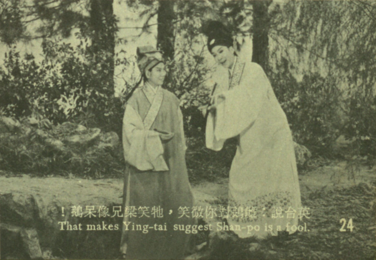 《梁山伯与祝英台》片中,「十八相送」是全片最美丽动人的一段戏。梁山伯和祝英台在杭州同窗三载,甚至会同床,却不晓得英台是女孩子,而英台对他,芳心早属,却有口难言。当英台奉召回乡,山伯送别十八里,她便把握这段途程,向山伯提出种种暗示,不料山伯淳朴书生,没有领悟她的譬喻,使她非常着急,不禁嗔骂「笑你梁兄真像呆头鹅!」
