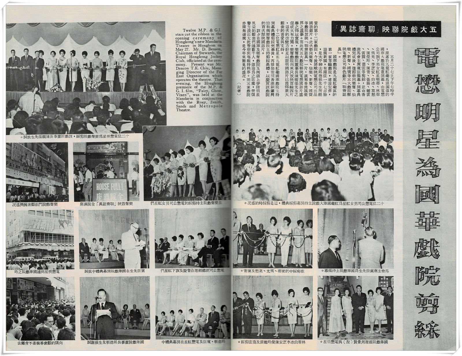 Twelve M.P. & G.I. stars cut the ribbon in the opening ceremony of Hongkong’s new Mandarin Theatre in Hunghom on May 27. Mr. D. Benson, Chairman of Stewards, the Royal Hongkong Jockey Club, officiated at the ceremony. Present was Mr. Deacon T.K. Chiu, Managing Director of the Far East Organisation which operates the theatre. That evening, the Hongkong premiere of the M.P. & G.I. film, “Fairy, Ghost, Vixen”, was held at the Mandarin in conjunction with the Roxy, Zenith, Sands and Metropole Theatre.