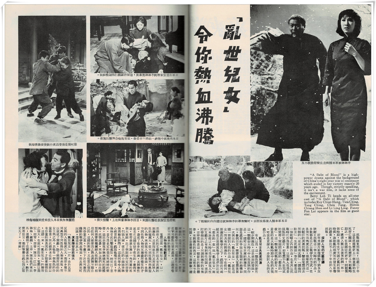 Betty Loh Ti heads an all-star cast of “A Debt of Blood”, which includes Roy Chiao Hung, Tien Ching, Tang Ching, Chen Fang, Hilton Chiang Shan and Li Ling Ling. Fanny Fan Lai appears in the film as guest star.