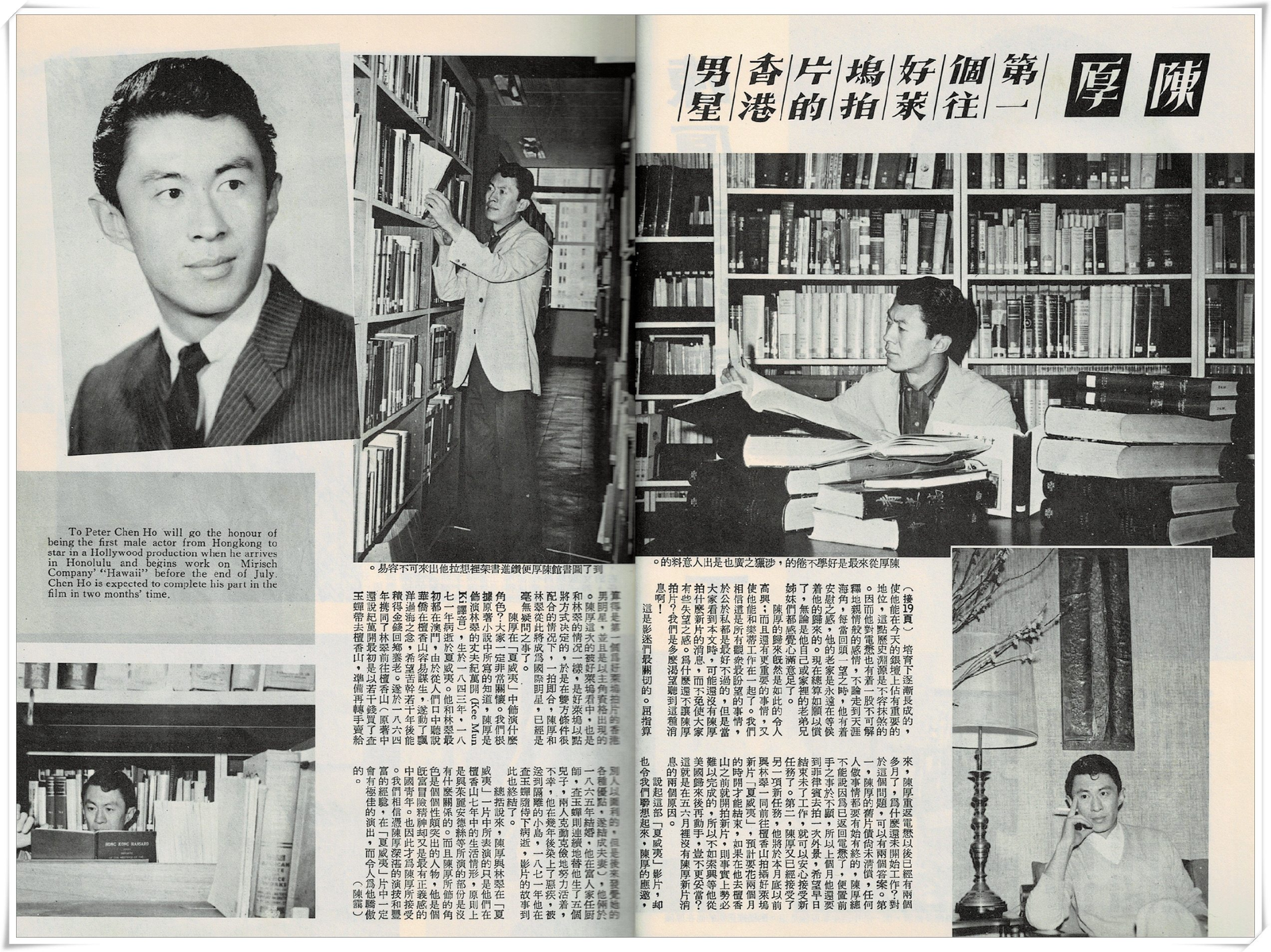 To Peter Chen Ho will go the honour of being the first male actor from Hongkong to star in a Hollywood production when he arrives in Honolulu and begins work on Mirisch Company’s “Hawaii” before the end of July. Chen Ho is expected to complete his part in the film in two months’ time.