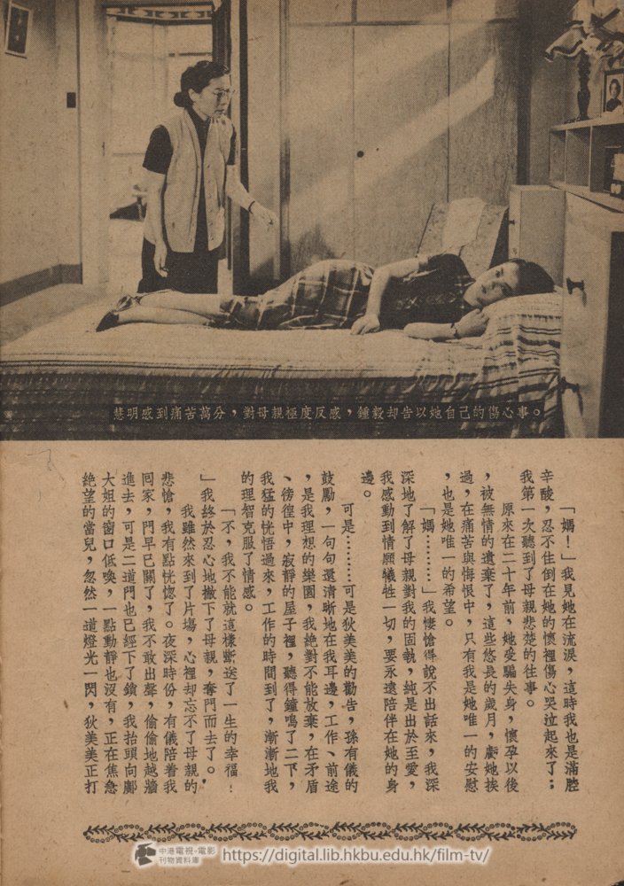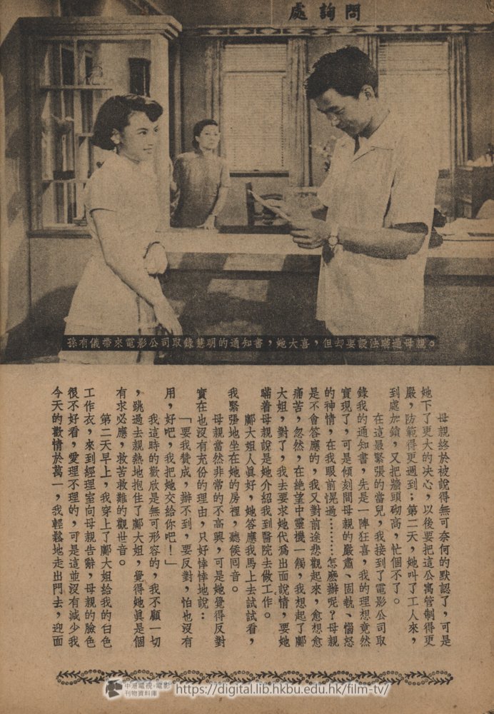 在這最緊張的當兒,我接到了電影公司取錄我的通知書,先是一陣狂喜,我的理想竟然實現了,可是傾刻間母親的嚴肅、固執、惱怒的神情,在我眼前晃過………怎麼辦呢?母親是不會答應的,我又對前途悲觀起來,愈想愈痛苦,忽然,在絕望中靈機一觸,我想起了鄺大姐,對了,我去要求她代為出面說情,要她瞞着母親說是她介紹我到醫院去做工作。鄺大姐人真好,她答應我馬上去試試看,我緊張地坐在她的房裡,聽候回音。