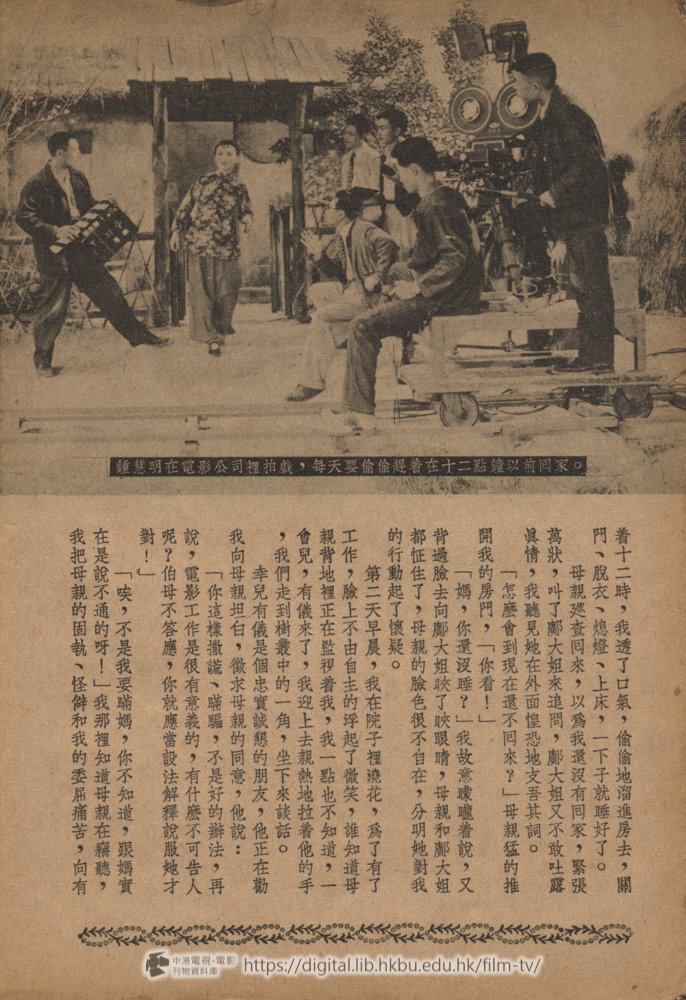 我在電影公司裡上了鏡頭了,時間在攝影場的工作中很快的消逝着,不覺已是夜深,我擔心地趕回家去,走進二道門,聽見時鐘正敲着十二時,我透了口氣,偷偷地溜進房去,關門、脫衣、熄燈、上床,一下子就睡好了。
