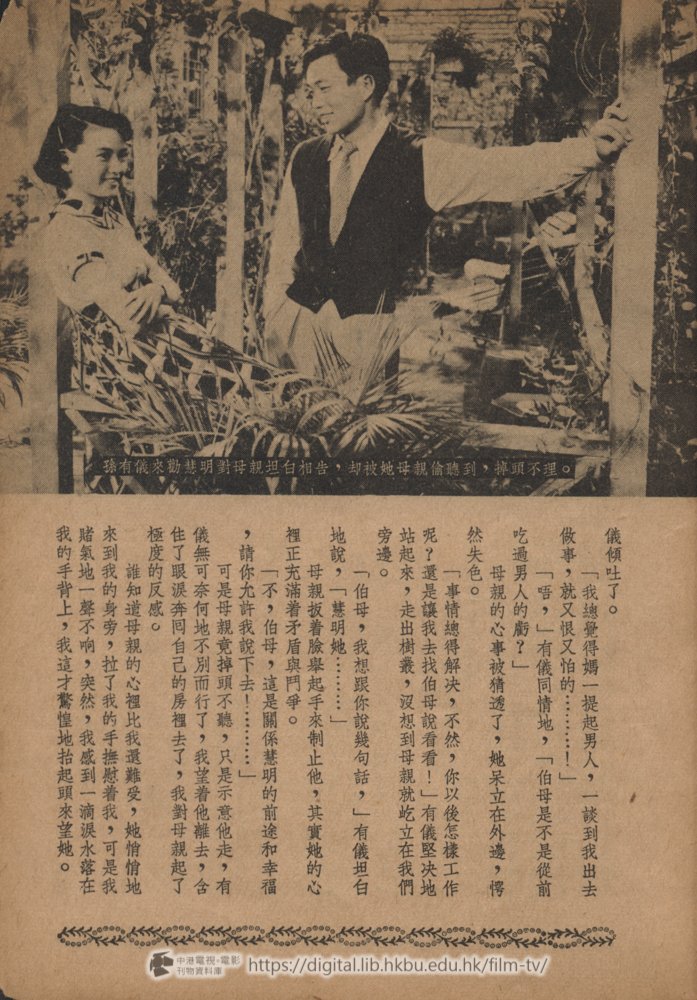 「伯母,我想跟你說幾句話,」有儀坦白地說,「慧明她………」母親扳着臉舉起手來制止他,其實她的心裡正充滿着矛盾與鬥爭。「不,伯母,這是關係慧明的前途和幸福,請你允許我說下去!」