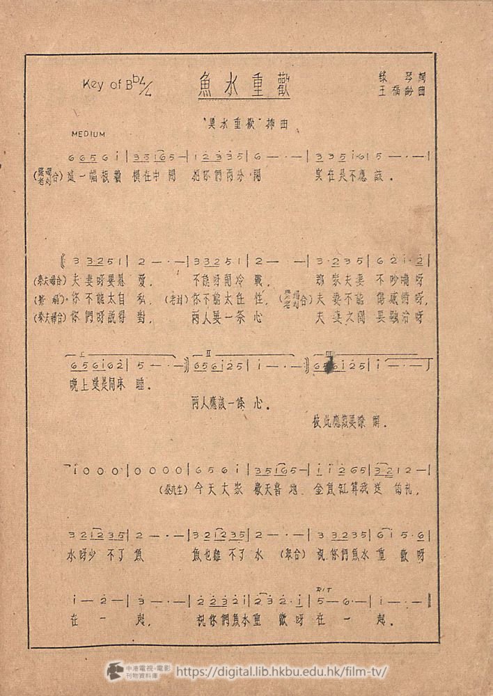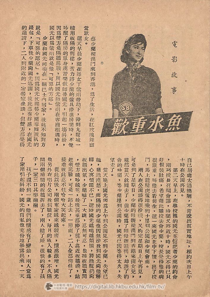 「魚水重歡」影片,卽是藉一對歡喜寃家的男女靑年身上,來說明夫婦之道。故事中的這對男女靑年,隔鄰血居,每因留聲機的响聲,或洗手間裏爭水,而引起一陣隔牆罵戰。但是儘管她與他三日一吵,五日一大駡,終因爲兩人的工作環境與時間的不同,始終未能當面罵戰,所以三百囘合駡戰下來,對面還是不識眞面目的。其實,在另外塲台中,他們却正是一對情投意合,論及婚嫁的熱戀情侶了。這點,故事卽寫出了「相見好、同住難」的社會現狀。事到後來,當然圖窮匕見,和好如初,締結良緣。故事的後半段,卽寫出夫婦之間的許多意氣之爭,正所謂「小不忍則亂大謀」,險些鬧成離婚的局面。
