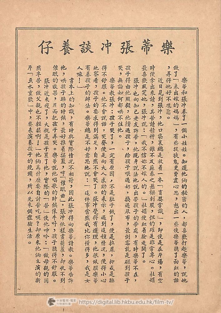張冲近來瘦了,大概是孩子累了他,實際的「苦」使他呻吟:「做母親的固然辛苦,做父親也不輕鬆啊!」他倆爲什麼要自討苦吃呢?却原來他倆主演的新片「魚水重歡」中,要表演養孩子的鏡頭,所以先來個體驗生活。