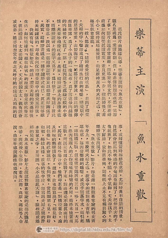 邵氏新片由羅臻執導,樂蒂主演的「魚水重歡」,顧名思義爲一愛情喜劇,但,却非僅供觀衆哄然一笑卽了事,影片主題非常嚴肅,指導靑年男女們,不僅在婚前應如何接受眞情實愛,並且更進一步,指出婚後尤需小心,保持或培植愛情,始足維持長久的夫婦之道,故極富敎育意義。