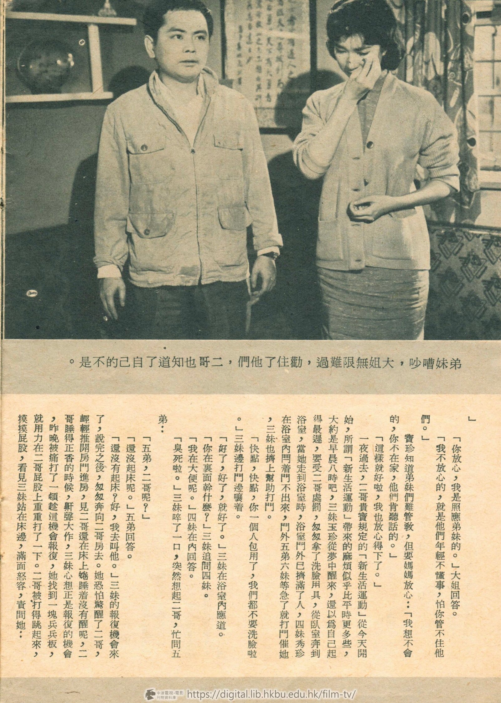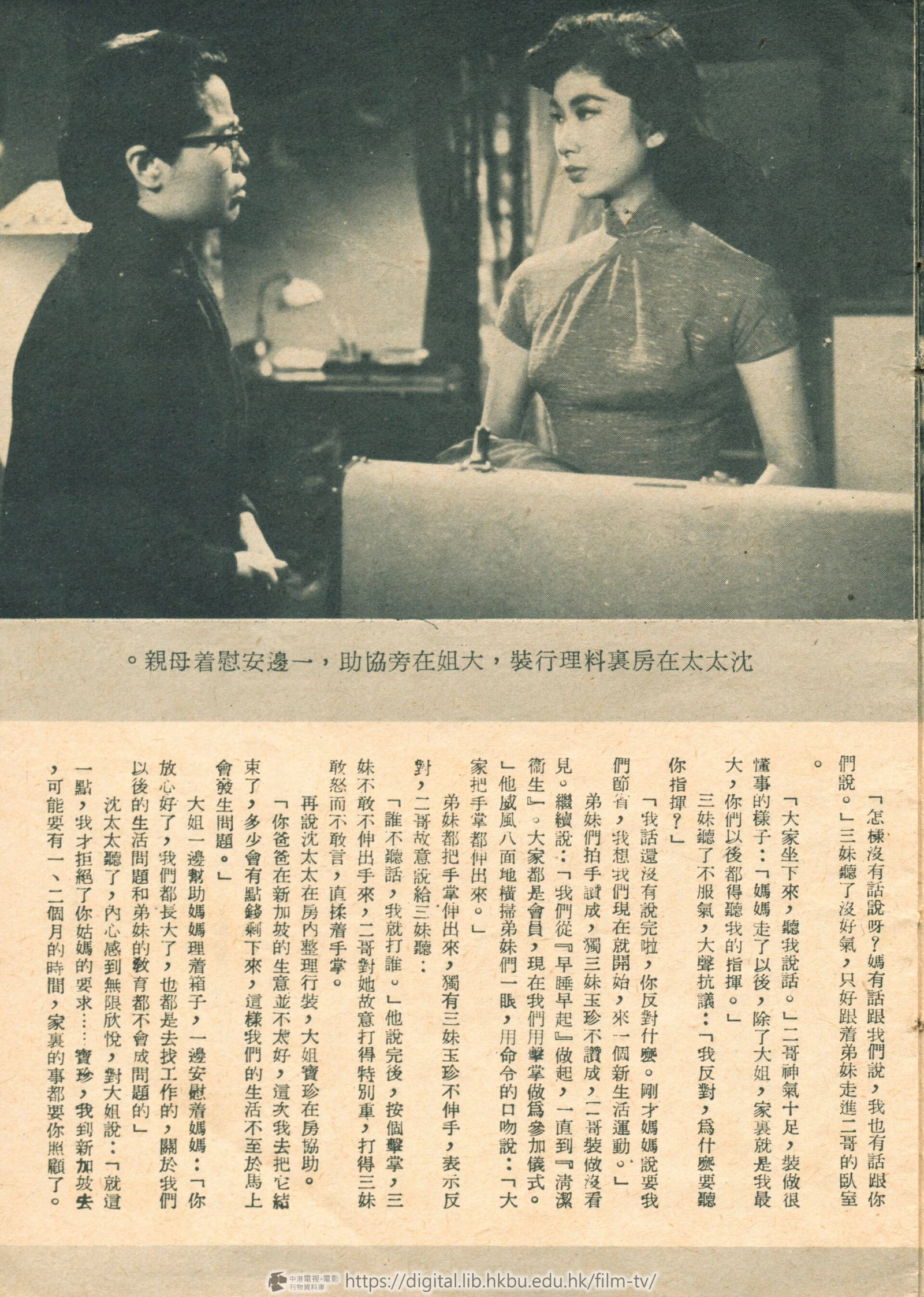 她唸到這裏,樓下的汽車喇叭聲响起來,大姐放下信,到窗口望下去,坐在汽車内的不是別人,正是金英這傢伙,她明白一定是約三妹出去了,當她走下樓梯時,三妹已盛裝準備赴約,在門口被二哥攔阻,二哥不放她出去,大姐也說金英這朋友不能交,不然就要吃虧的,三妹聽了,乘機撒賴: