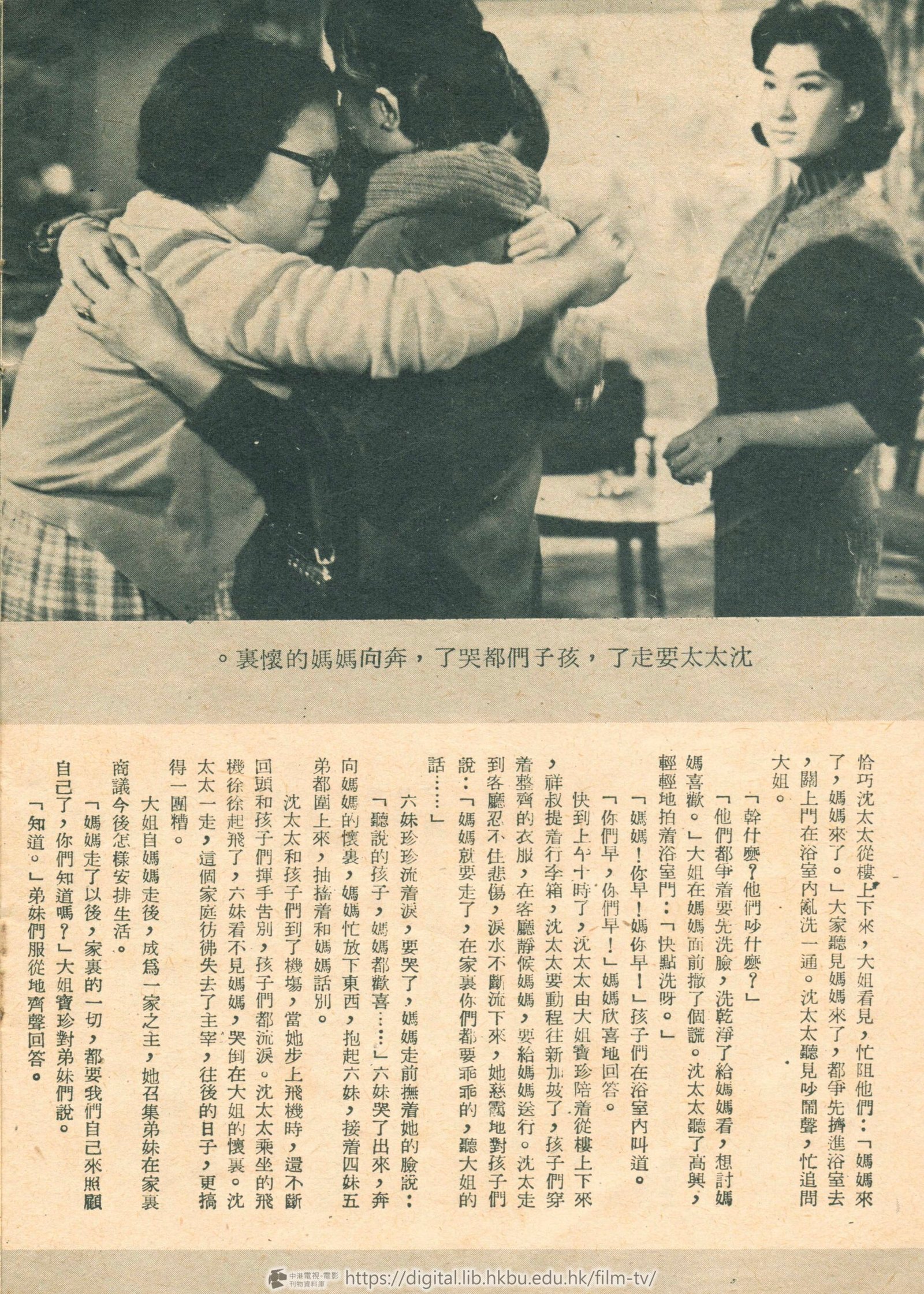 次日,不幸的消息傳來:由星加坡飛港的客機在途中遇雷雨,失事墮燬,男女旅客無一生還,全港報紙這樣刋載着,並附旅客名單,沈先生也是其中遇難者之一。噩耗傳到沈家,闔俯悲慟欲絕,沈太太變成了未亡人,六個孩子的敎育問題隨着沈先生慘遭不幸,發生種種困難,親戚們都在互相議論着沈家的善後問題,尤其是這些兒女的將來,沈太太這時哭成淚人兒似的,孩子們依偎在媽媽身旁抽搐,親友們看見這羣孩子,都不禁憐憫起來,年老的伯父感嘆地說:「人已死了,悲傷也沒有用,現在很多問題等待着解決,尤其是這幾個孩子的敎養問題,我們要多負點責任。」
