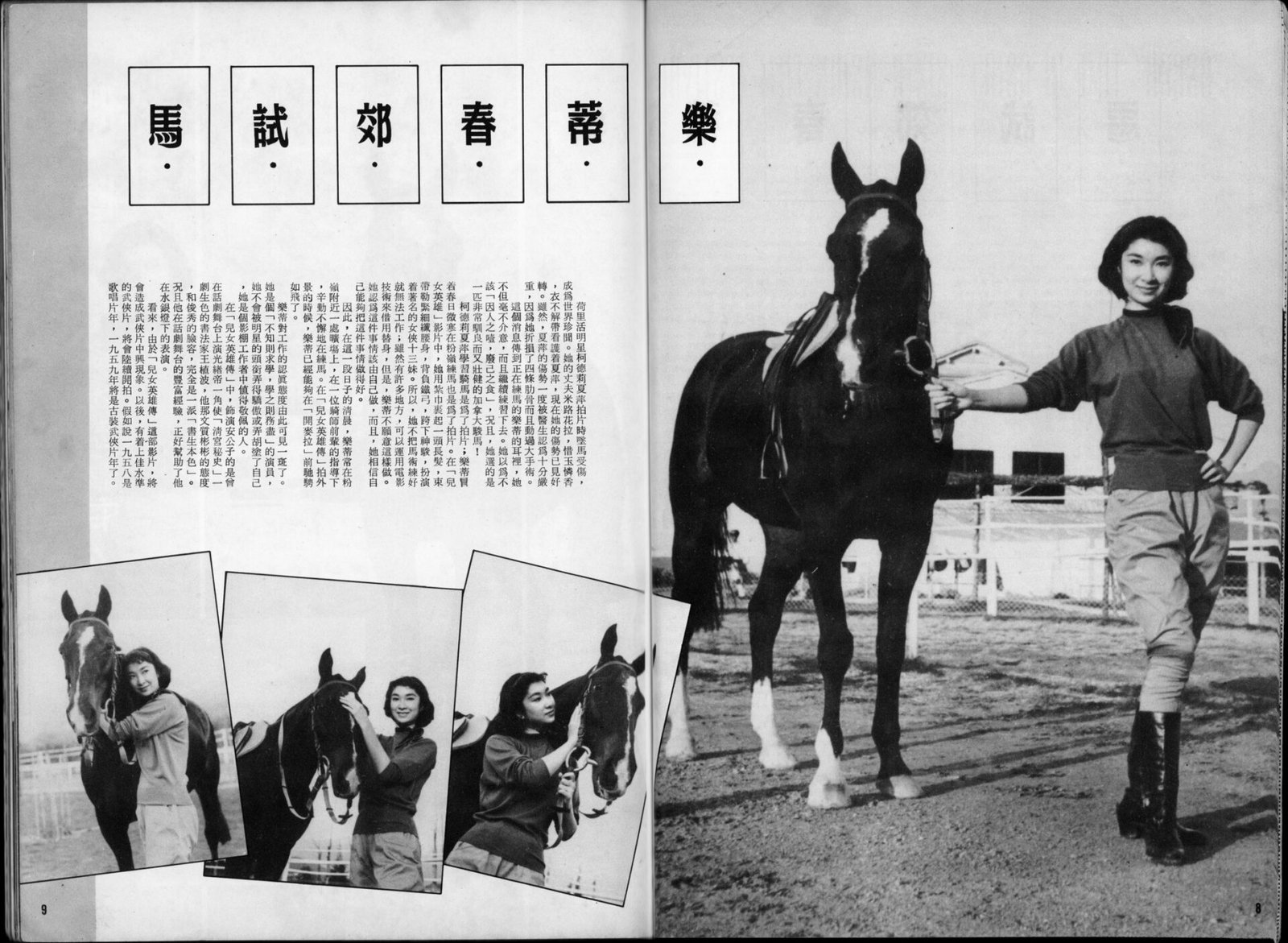柯德莉夏萍學習騎馬是爲了拍片;樂蒂冒着春日微寒在粉嶺練馬也是爲了拍片。在「兒女英雄」影片中,她用紮巾裹起一頭長髮,束帶勒緊細纖腰身,背負鐵弓,跨下神駿,扮演着著名的女俠十三妹。所以,她不把馬術練好就無法工作;雖然有許多地方,可以運用電影技術來借用替身,但是,樂蒂不願意這樣做。她認爲這件事情該由自己做,而且,她相信自己能夠把這件事情做得好。