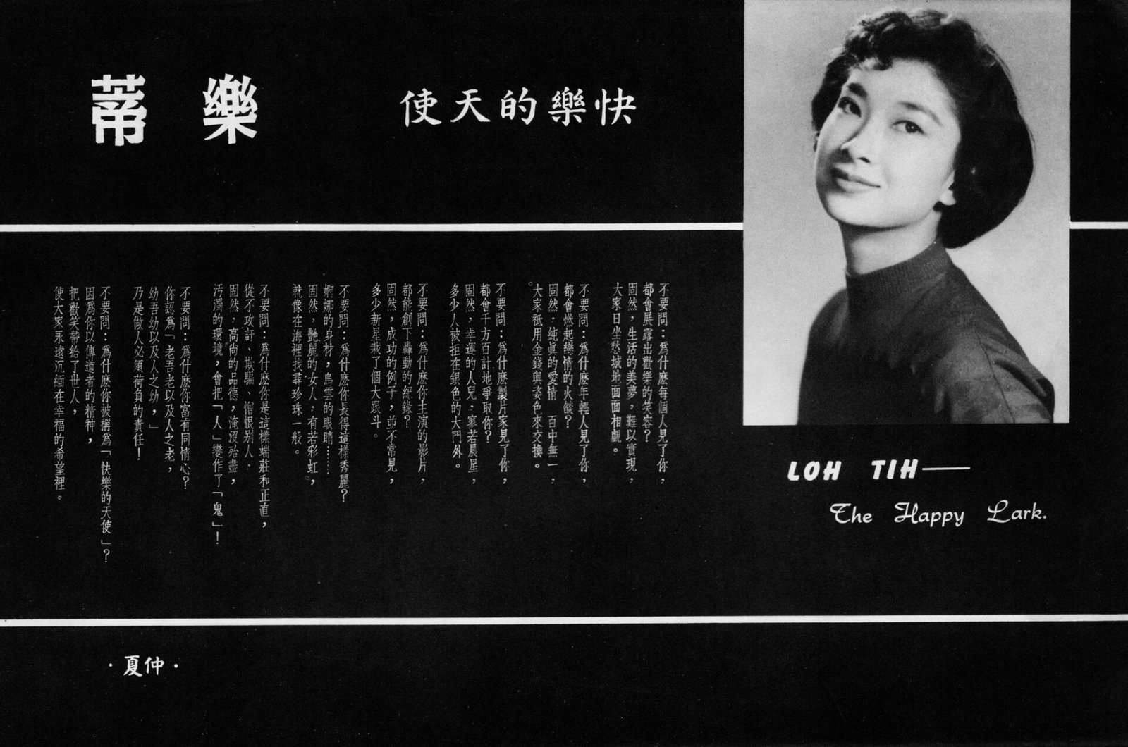 樂蒂是一九五七年加入邵氏公司作基本演員的,公司方面對她甚爲重視,先後讓她主演了三部戲路完全不同的戲:「妙手回春」裡的女護士,「殺人的情書」裡的業餘偵探,和「兒女英雄傳」裡的俠女十三妹。樂蒂果然不負公司所望,演來唯肖唯妙。上兩部戲在外地推廣時,都創極高的票房紀錄。憑這樣輕的年紀而能在影壇有這樣的地位,目前還祇樂蒂一人,可見樂蒂的前途是無可限量的。