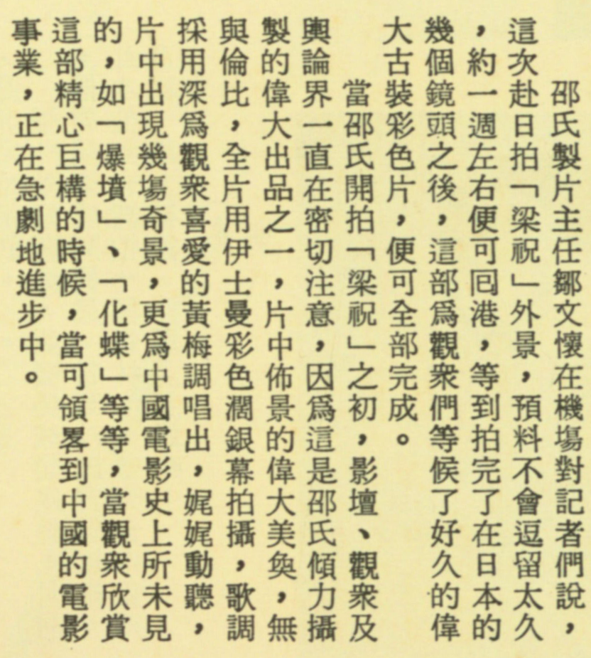 邵氏製片主任鄒文懷在機場對記者們說,這次赴日拍《梁祝》外景,預料不會逗留太久,約一週左右便可回港,等到拍完了在日本的幾個鏡頭之後,這部為觀眾們等候了好久的偉大古裝彩色片,便可全部完成。