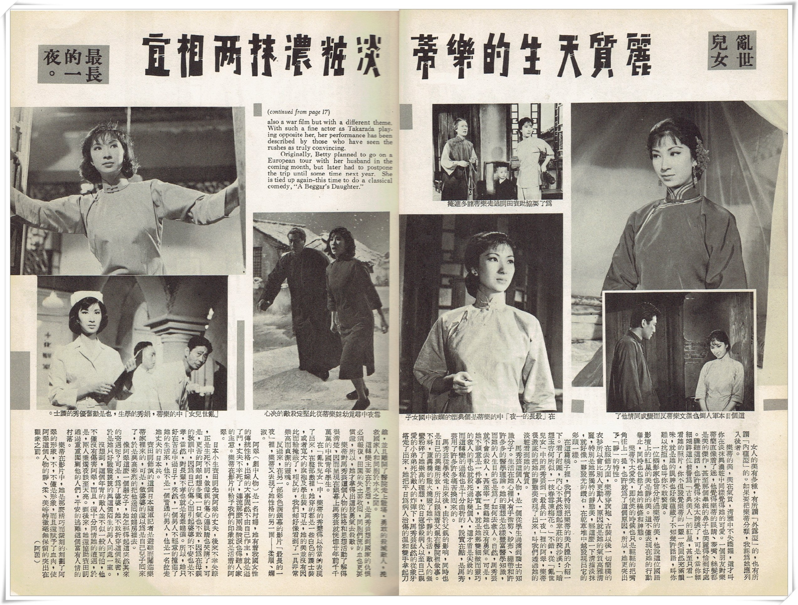 在這篇稿子裡,我們特別把樂蒂的美具體的介紹一下。看了附圖,內心不其然想起草莊的浣沙溪:「一暗想玉容何所似,一枝春雪凍梅花。」不錯,從「亂世兒女」中的馬秀芸到「最長的一夜」裡的阿翠,樂蒂很澈底的把她的靜態美表現了出來,叫我們透過她的馬秀芸這個人物,是一個從學生過渡到護士的知識分子。生活在她心裡只有手術剪、紗布、繃帶和許多多的醫學理論。她的理想是怎樣豐富醫學知識,讓她的人生目的也是爲了如何去救人。自然,馬秀芸就不會去殺人,甚至宰一隻鷄她也沒有勇氣。可是,她的救人的手也就殺死過好幾個人,這矛盾是尖銳的,而這轉變的過程也是十分曲折的,說實在點,是馬秀芸用了許多許多痛苦換回來的。