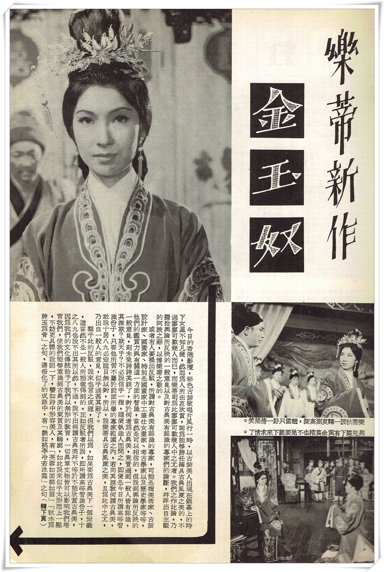 因此,一般人皆能認識與欣賞古典美,在並非過甚其辭,樂蒂之所以被稱爲典型的古典美人,確乎是一般所公認的。樂蒂這位以古典美人飲譽於時的紅星,加入電懋以後,一連主演了「亂世兒女」—「最長的一夜」兩部時裝片,現在接着又給她開拍一部「金玉奴」,這是一部古裝片,電懋當然要爲樂蒂開拍古裝片,像樂蒂如此一個人才,豈能不盡其所長?