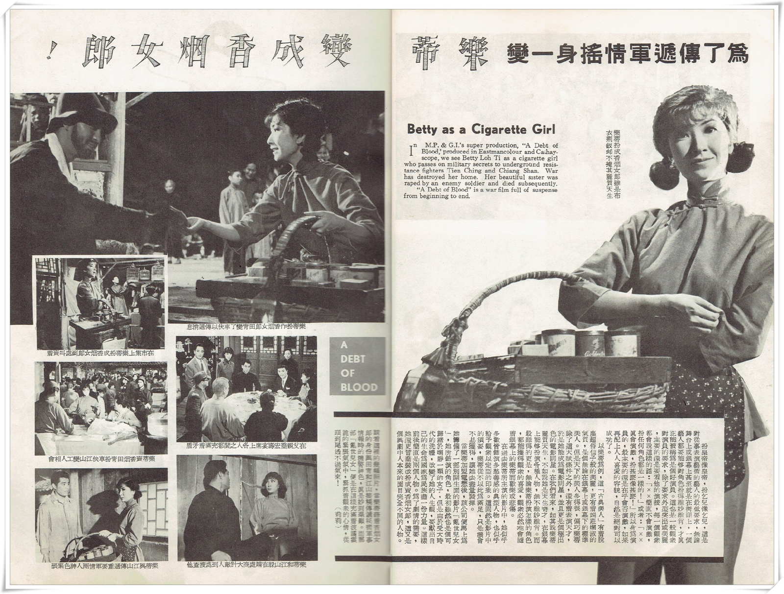 In M.P. & G.I.’s super production, “A Debt of Blood,” produced in Eastmancolour and Cathayscope, we see Betty Loh Ti as a cigarette girl who passes on military secrets to underground resistance fighters Tien Ching and Chiang Shan. War has destroyed her home. Her beautiful sister was raped by an enemy soldier and died subsequently. “A Debt of Blood” is a war film full of suspense from beginning to end.