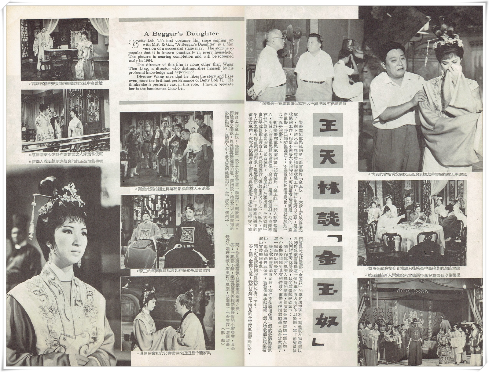 對於樂蒂在電懋主演的第一部古裝片「金玉奴」一般人都非常關心,所關心的是電懋爲何選擇像「金玉奴」這樣一個題材,作爲樂蒂在他們旗下演出的第一部古裝片。「金玉奴」故事出自「今古奇觀」,由於早就被搬上舞台上,成爲最流行的傳統戲劇名作之一的緣故,許多人對之都有相當深刻的印象,電懋這部「金玉奴」中樂蒂所飾演的這個女主角,究竟其依據舞台上習見的典型塑造,還是闢途徑呢?我們曾爲此走訪這部「金玉奴」的掌舵者王天林,請他就人物造型以及特別爲樂蒂選擇這一個故事的原因所在予以說明。爲了節省篇幅,我們將王天林所談,以問答體裁紀錄如下: