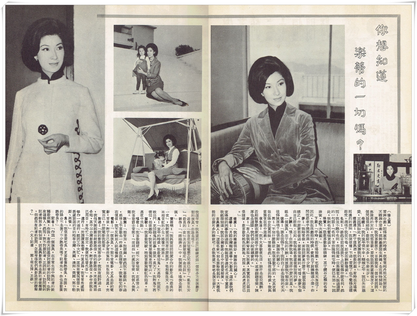 新作:「我自從加盟電懋公司後已拍了『亂世兒女』、『最長的一夜』及古裝歌唱片『金玉奴』。」