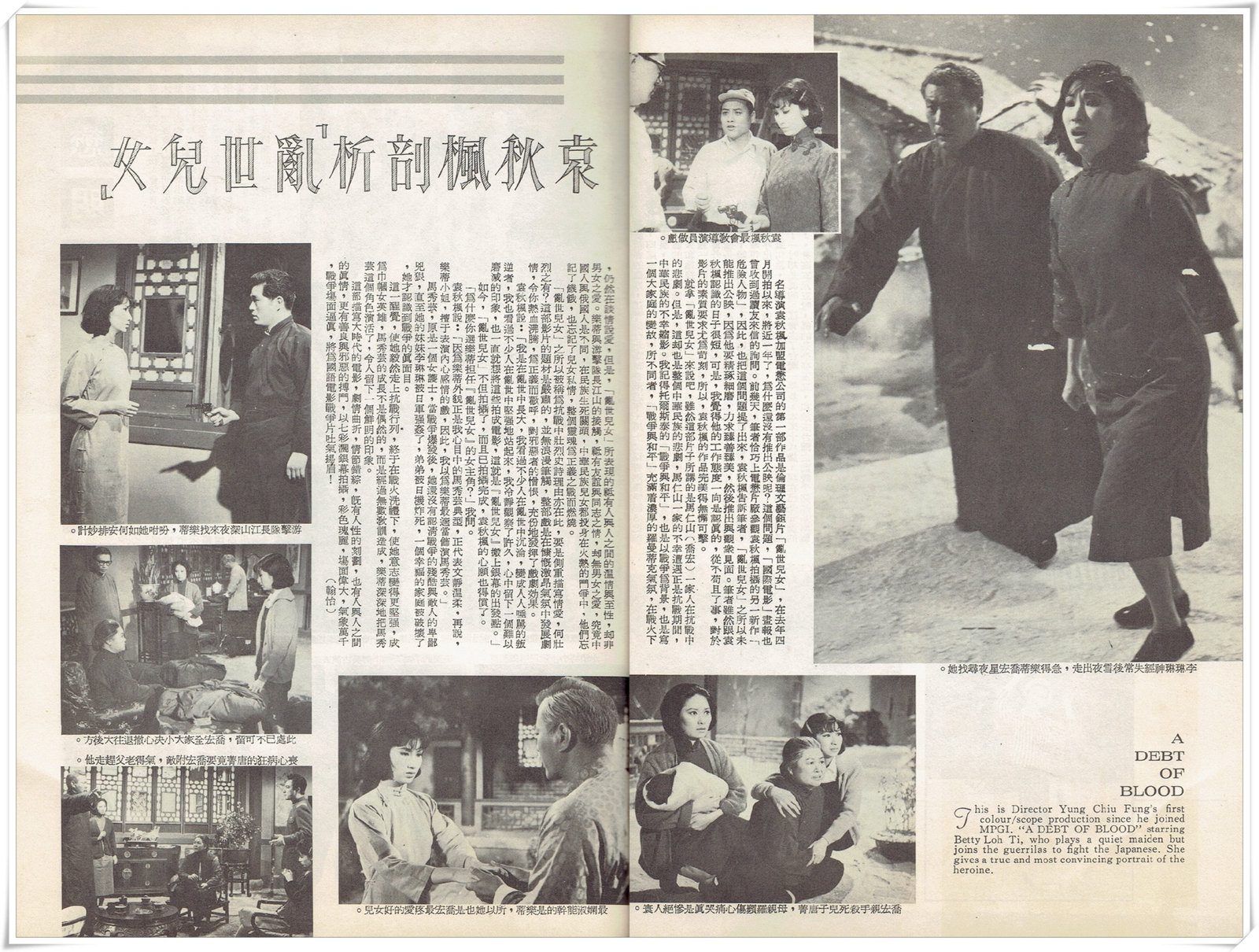 This is Director Yung Chiu Fung's first colour/scope production since he joined MPGI. “A DEBT OF BLOOD” starring Betty Loh Ti, who plays a quiet maiden but joins the guerrillas to fight the Japanese. She gives a true and most convincing portrait of the heroine.