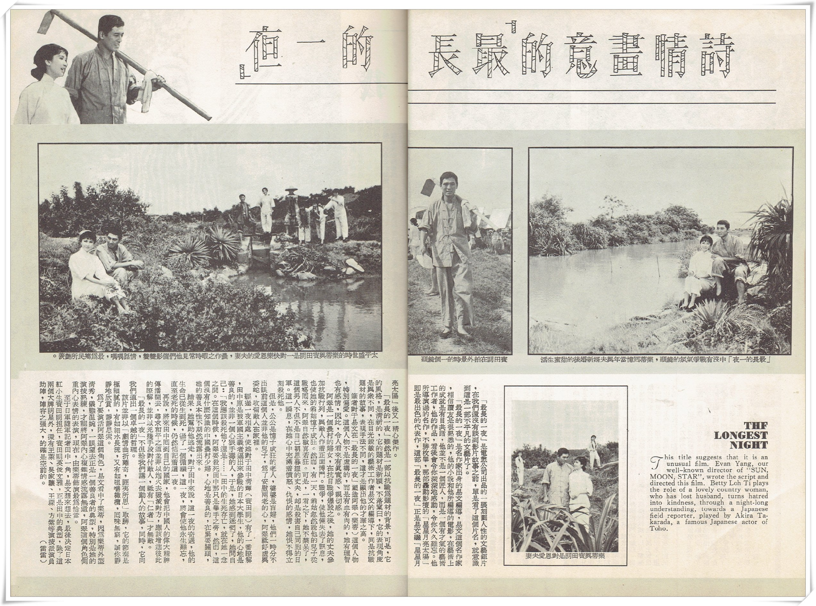 This title suggests that it is an unusual film. Evan Yang, our well-known director of “SUN, MOON, STAR”, wrote the script and directed this film. Betty Loh Ti plays the role of a lovely country woman, who has lost husband, turns hatred into kindness, through a night-long understanding, towards a Japanese field reporter, played by Akira Takarada, a famous Japanese actor of Toho.