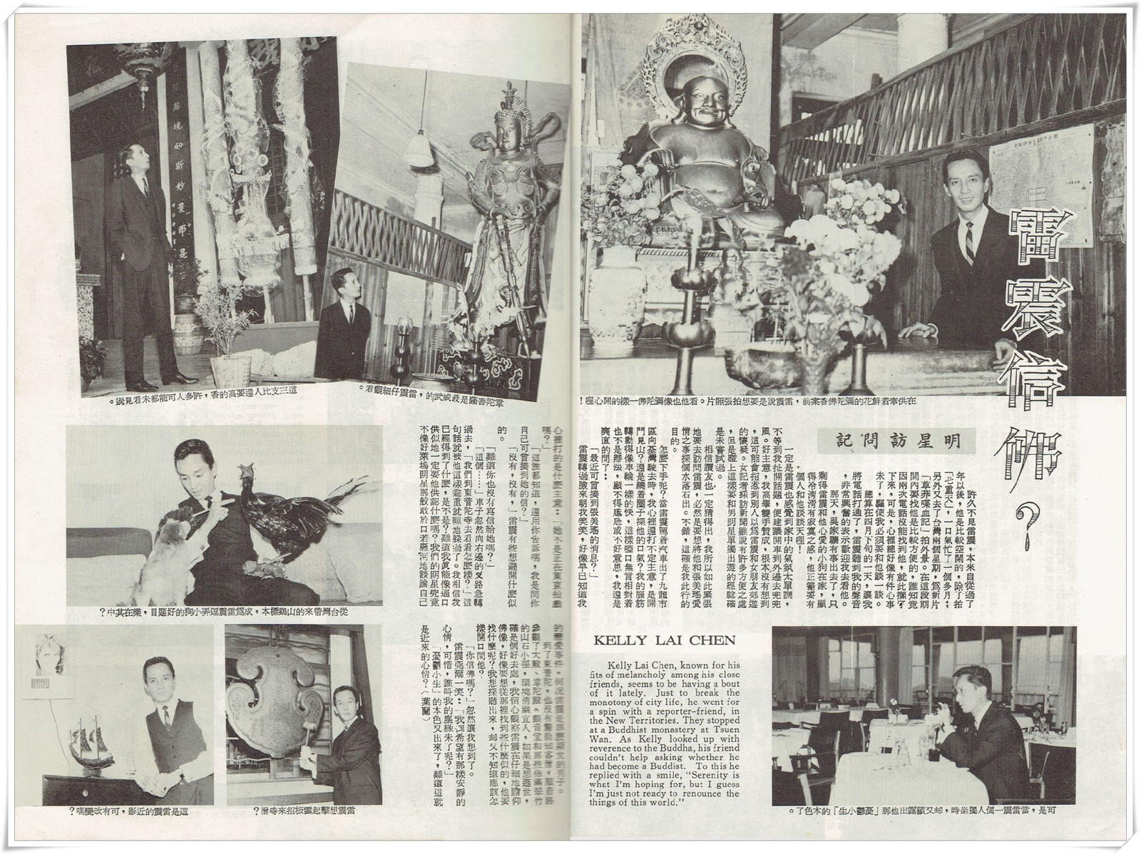 Kelly Lai Chen, known for his fits of melancholy among his close friends, seems to be having a bout of it lately. Just to break the monotony of city life, he went for a spin with a reporter-friend, in the New Territories. They stopped at a Buddhist monastery at Tsuen Wan. As Kelly looked up with reverence to the Buddha, his friend couldn't help asking whether he had become a Buddhist. To this he replied with a smile, “Serenity is what I'm hoping for, but I guess I'm just not ready to renounce the things of this world.”