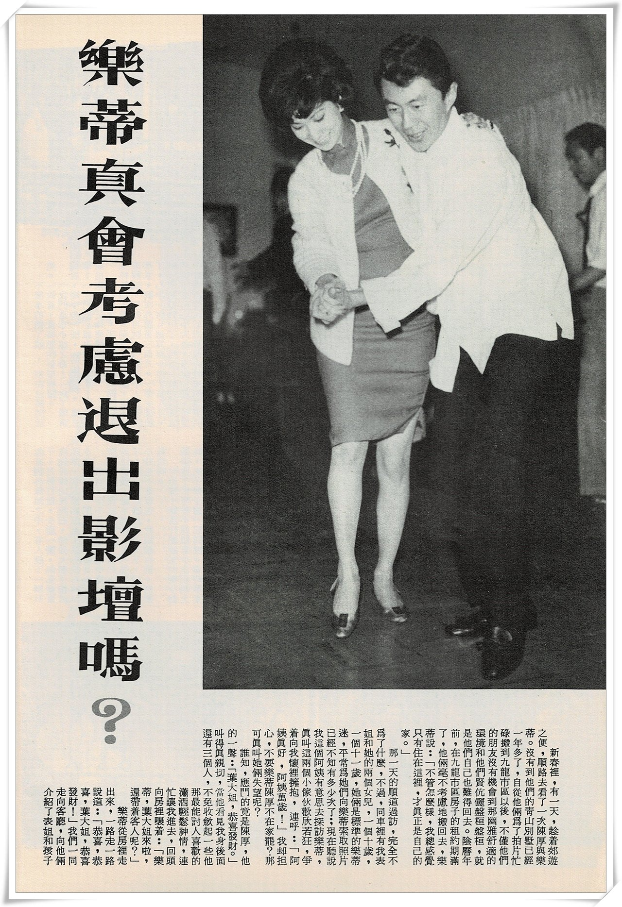 表姐在和陳厚說話,樂蒂忽然想起什麼,對我說:「葉大姐,我遇上了一件頭痛的事,不知怎麼辦才好,你替我出出主意好不好?」她繼續說:「最近半個月來,影迷的來信突然增多了,十之八九都針對一個問題:『問我是否在這次與國泰機構的合同期滿後考慮退出影壇?』你說叫我怎樣處理?怎樣回答?連彼得也想不出個妥善辦法來。」