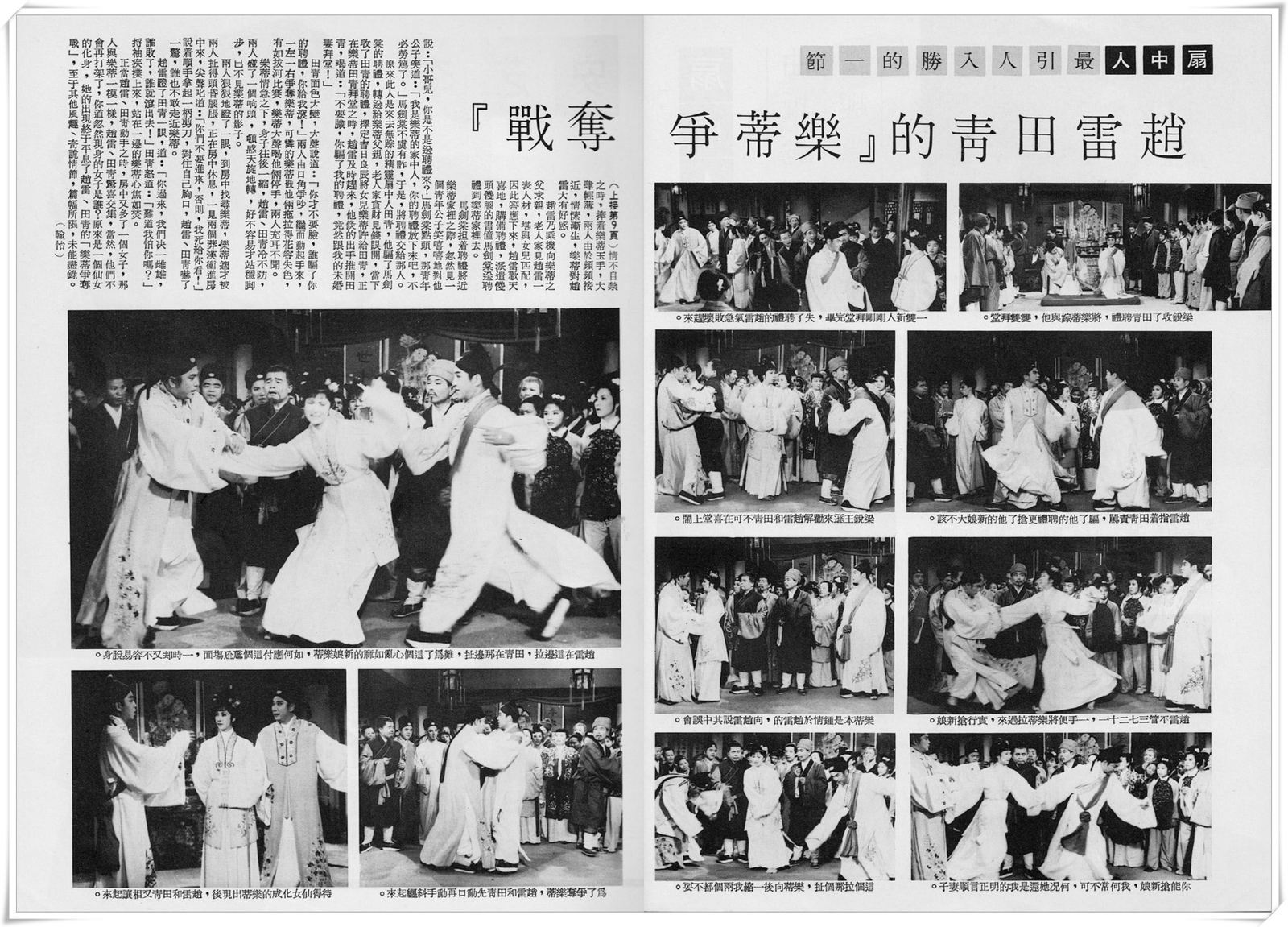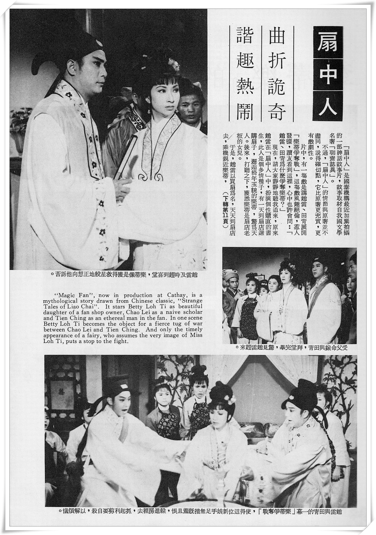 “Magic Fan”, now in production at Cathay, is a mythological story drawn from Chinese classic, “Strange Tales of Liao Chai”. It stars Betty Loh Ti as beautiful daughter of a fan shop owner, Chao Lei as a naive scholar and Tien Ching as an ethereal man in the fan. In one scene Betty Loh Ti becomes the object for a fierce tug of war between Chao Lei and Tien Ching. And only the timely appearance of a fairy, who assumes the very image of Miss Loh Ti, puts a stop to the fight.
