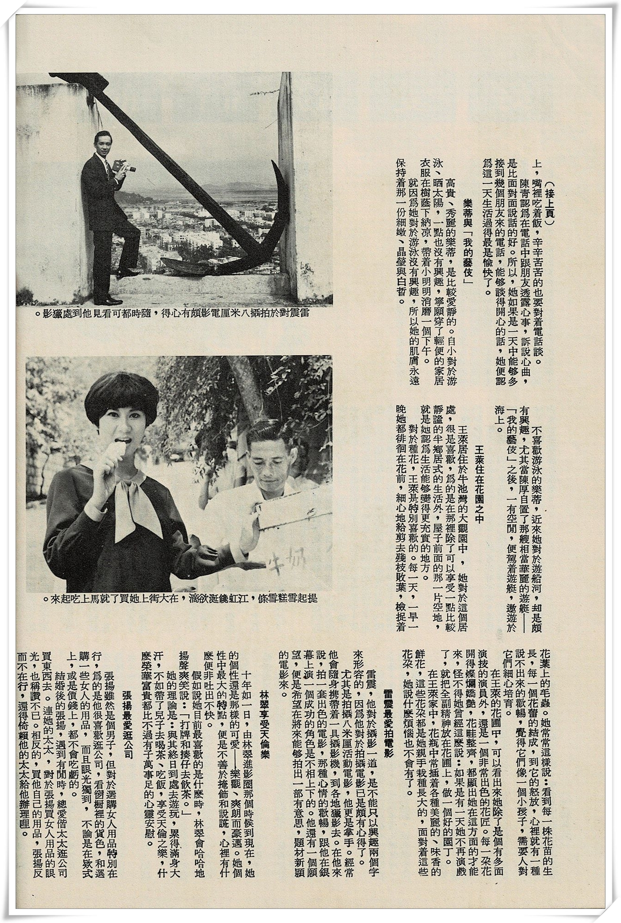 尤其是拍攝八米厘活動電影,他更是拿手。經常他會隨身攜帶着一具攝影機,到各地獵影去。在他來說,拍一套出色的電影,那種心情的歡暢,跟他在銀幕上演一個成功的角色是不相上下的。他還有一個願望,便是希望在將來能夠拍出一部有意思的,題材新穎的電影來。