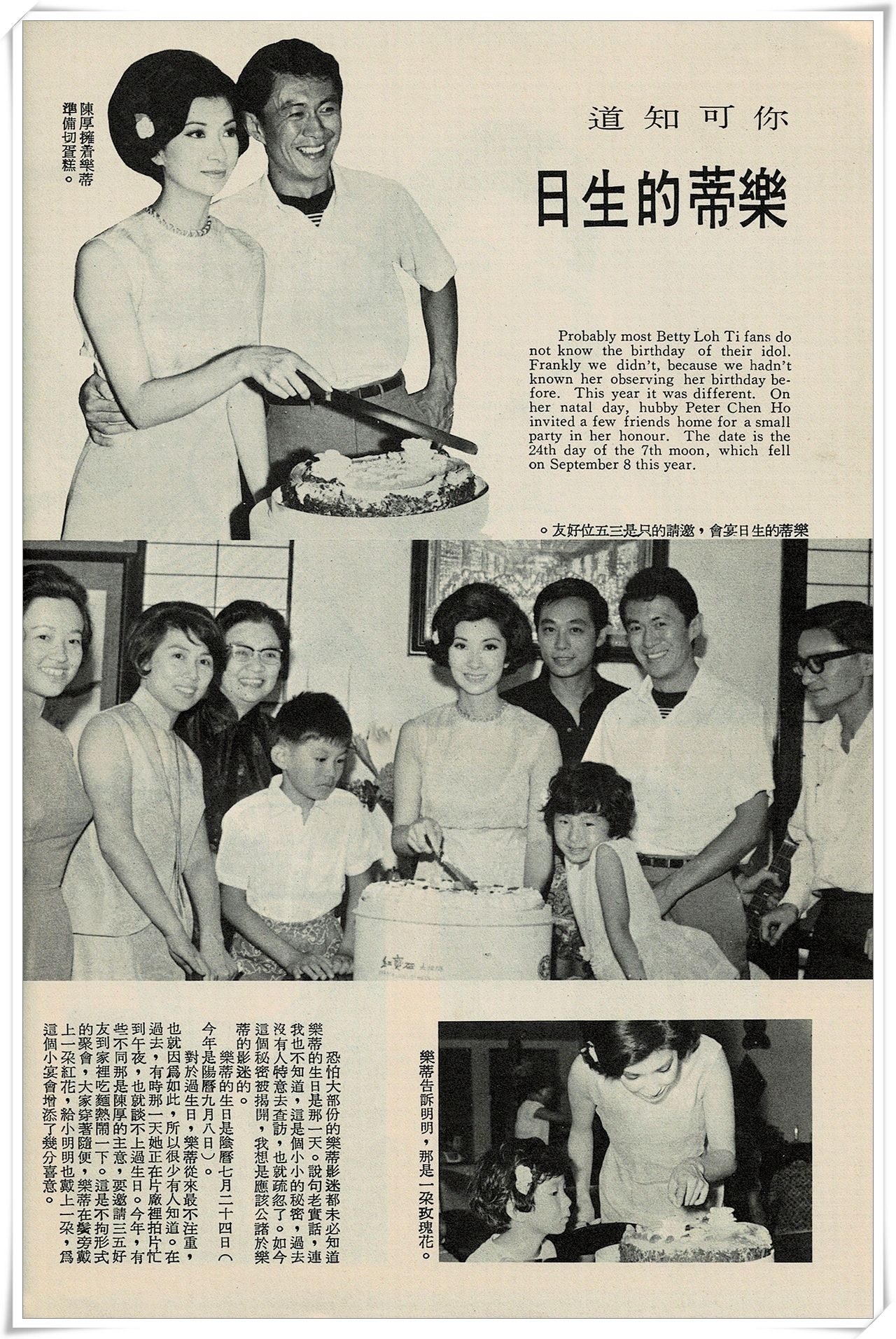 今年是陽曆九月八日(陰曆七月二十四日),對於過生日,樂蒂從來最不注重,也就因爲如此,所以很少有人知道。在過去,有時那一天她正在片廠裡拍片忙到午夜,也就談不上過生日。今年,有些不同那是陳厚的主意,要邀請三五好友到家裡吃麵熱鬧一下。這是不拘形式的聚會,給小明明也戴上一朵紅花,為這個小宴會增添了幾分喜意。