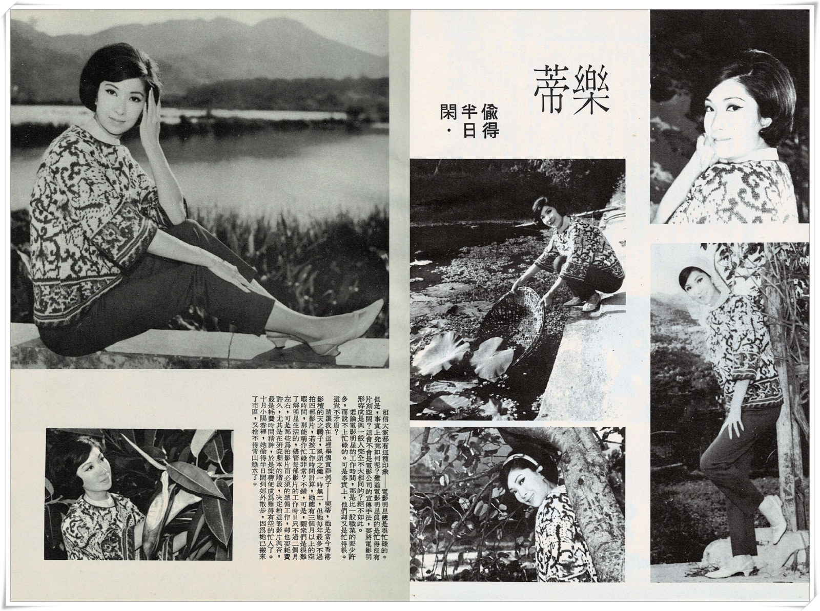 請讓我在這裡舉個實際例子——樂蒂,她是當今香港影壇的天之驕子,風頭之健一時無二,但她每年最多不過拍四部影片,若按工作時間計算,她總有三個月以上的空暇時間,那能稱作忙碌非常?不錯,可是,觀衆們是很難了解明星生活的,儘管每部影片的工作時日只不過二個月左右,可是在那些爲拍影片而必須的準備工作,卻也要耗費許久,尤其是在研究劇本的階段,決定拍這部影片與否,最是耗費時間精神,於是樂蒂便成爲難得有空的忙人了。