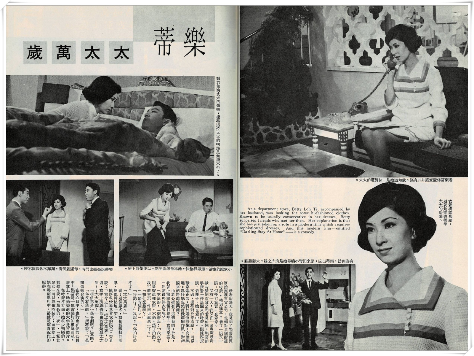 At a department store, Betty Loh Ti, accompanied by her husband, was looking for some hi-fashioned clothes. Known to be usually conservative in her dresses, Betty surprised friends who met her then. Her explanation is that she has just taken up a role in a modern film which requires sophisticated dresses. And this modern film—entitled “Darling Stay At Home”—is a comedy.