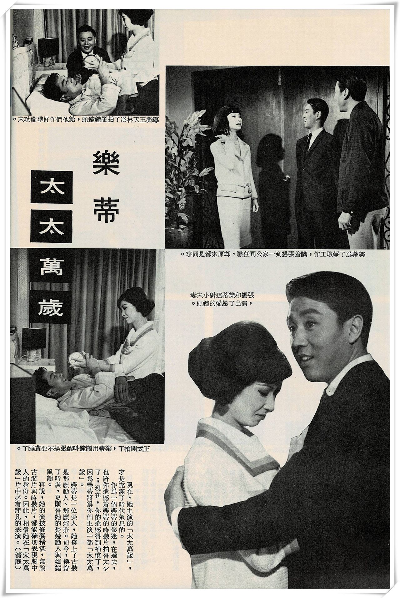 最近,已使樂蒂勞而有值。因為國泰機構給她開拍了一部叫「太太萬歲」的時裝喜劇,男主角是張揚。在這部片中,樂蒂飾演一個賢淑的妻子。演來輕鬆、明快,令你一新耳目。