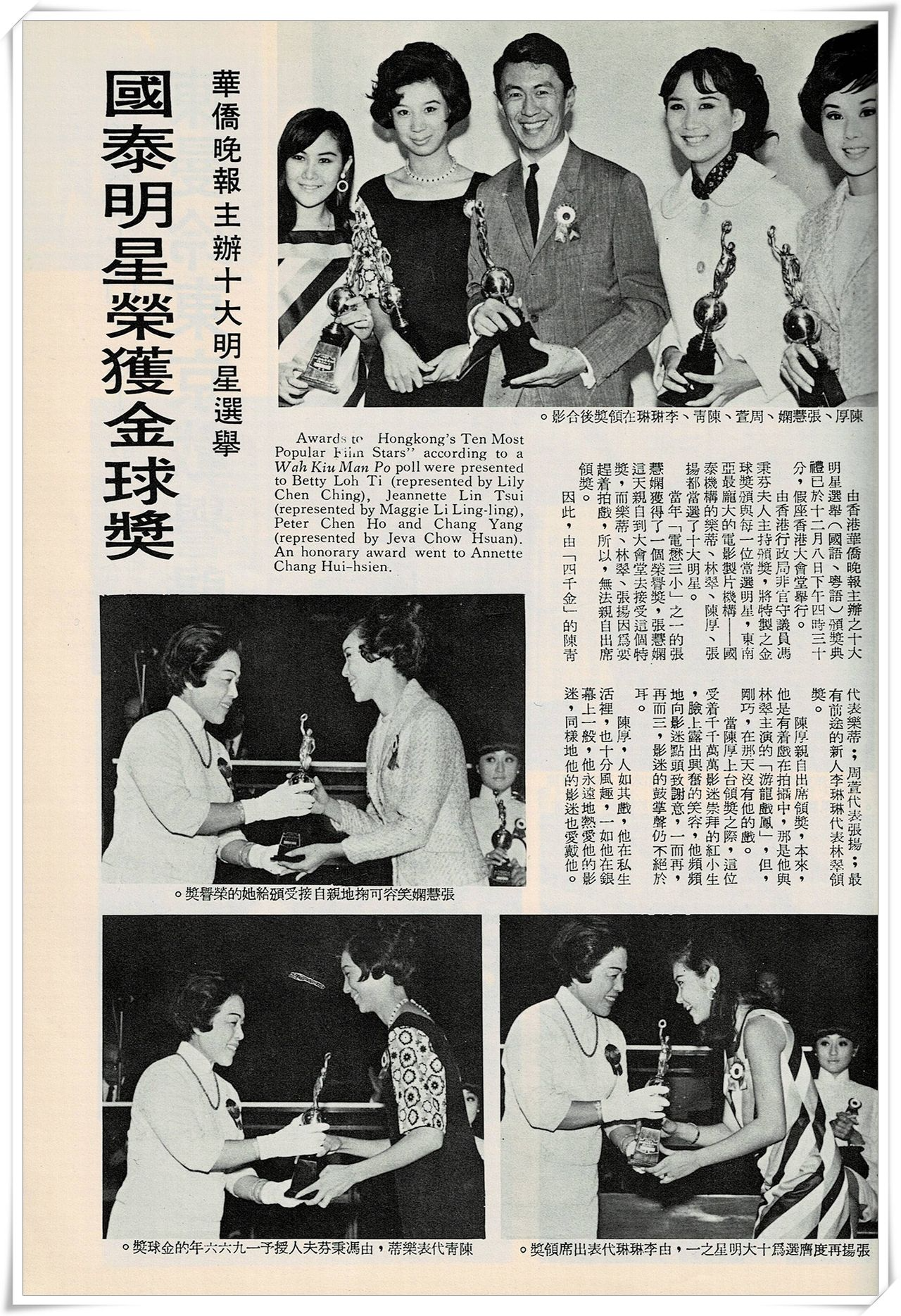 Awards to “Hongkong’s Ten Most Popular Film Stars” according to a Wah Kiu Man Po poll were presented to Betty Loh Ti (represented by Lily Chen Ching), Jeannette Lin Tsui (represented by Maggie Li Ling-ling), Peter Chen Ho and Chang Yang (represented by Jeva Chow Hsuan). An honorary award went to Annette Chang Hui-hsien.
