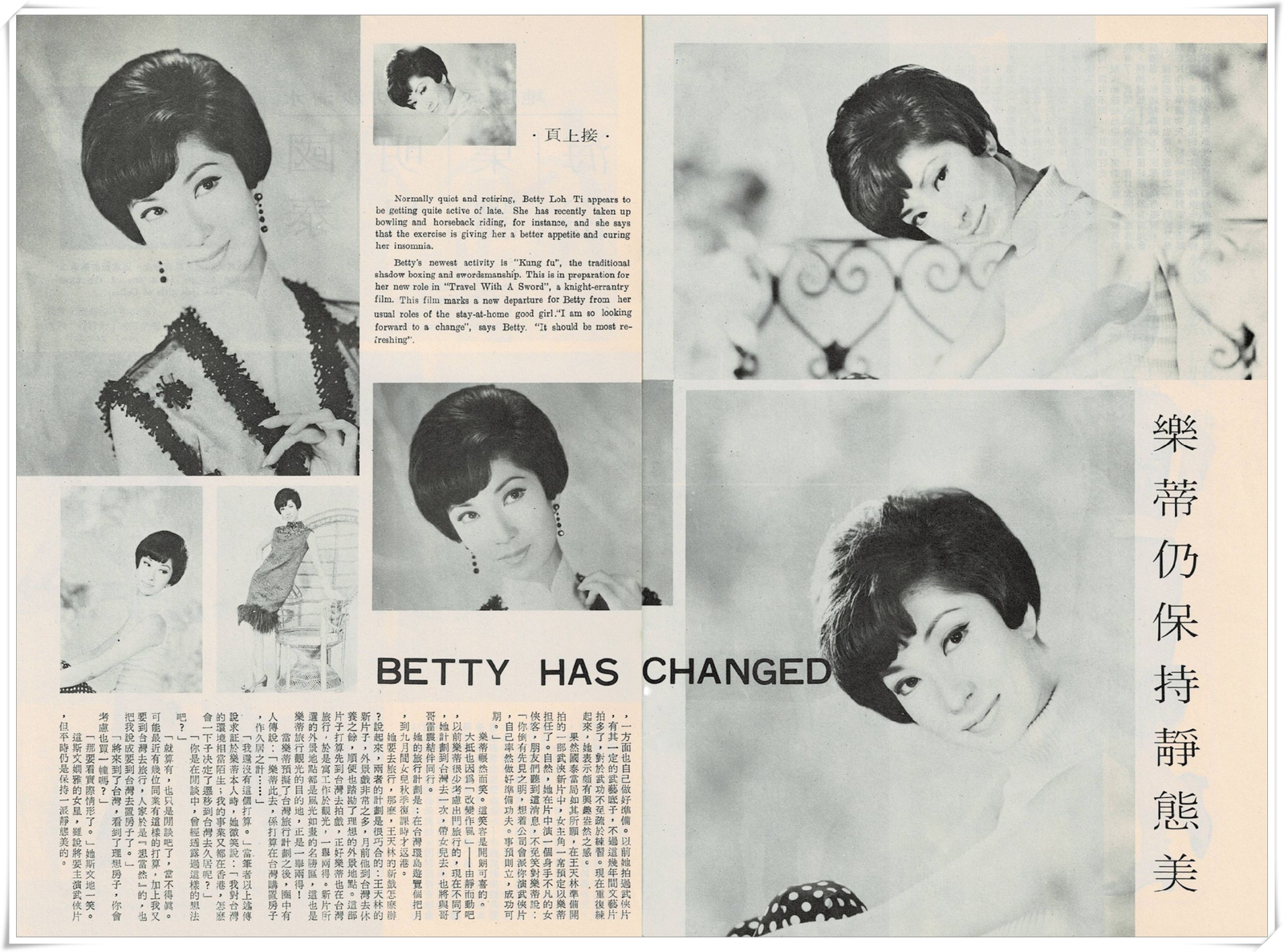 Betty’s newest activity is “Kung fu”, the traditional shadow boxing and swordsmanship. This is in preparation for her new role in “Travel With A Sword”, a knight-errantry film. This film marks a new departure for Betty from her usual roles of the stay-at-home good girl. “I am so looking forward to a change”, says Betty. “It should be most refreshing”.