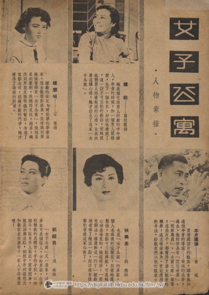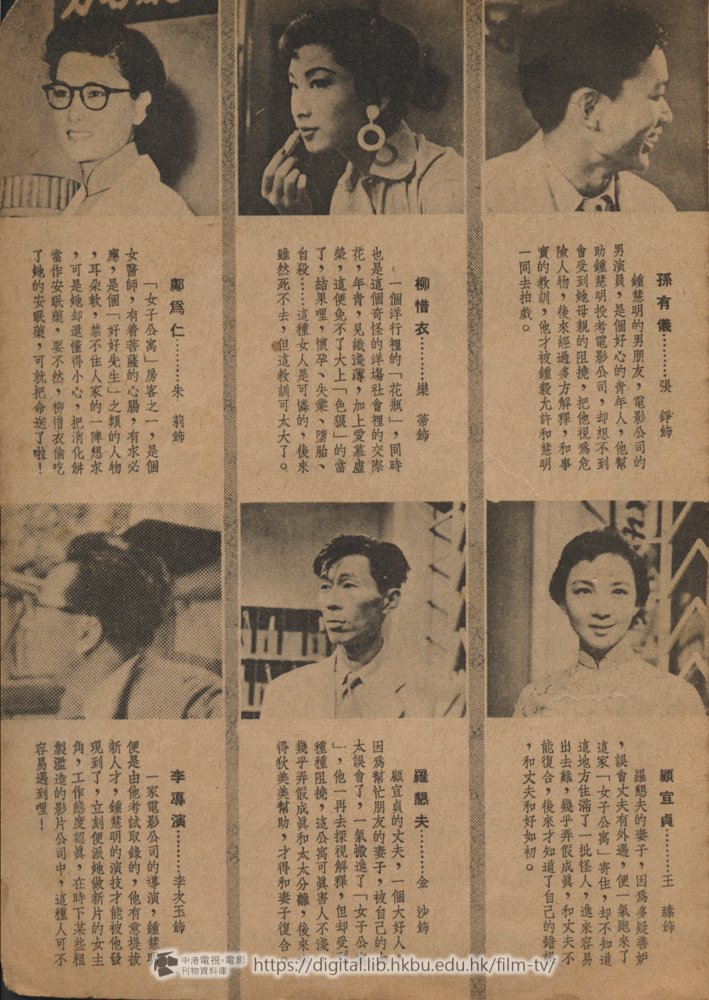 “女子公寓”房客之一,是个女医师,有着菩萨的心肠,有求必应,是个“好好先生”之领的人物,耳朵软,锺慧明的演技才被他发掘到了,立刻便派她做新片的女主角,工作态度认真,在时下某些粗制滥造的影片公司中,这种人可不容易遇到哩!