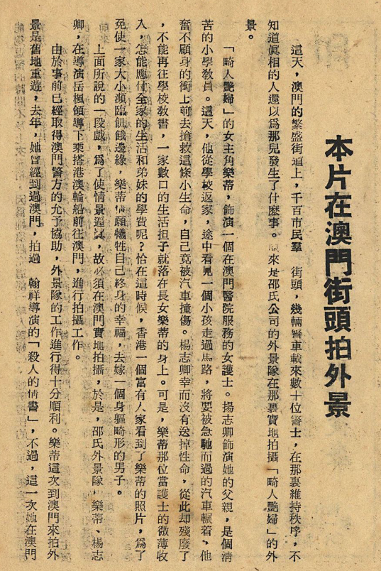 由於事前已經取得澳門警方的允予協助,外景隊的工作進行得十分順利。樂蒂這次到澳門來拍外景是舊地重遊,去年,她曾經到過澳門,拍過 翰群導演的「殺人的情書」,不過,這一次她在澳門能夠逗留的時間不及上次充裕,因為她須趕完這部「畸人艷婦」,她所擔任的鏡頭,便要立即起程赴新加坡去拍另一部新片「蕉風椰雨」。