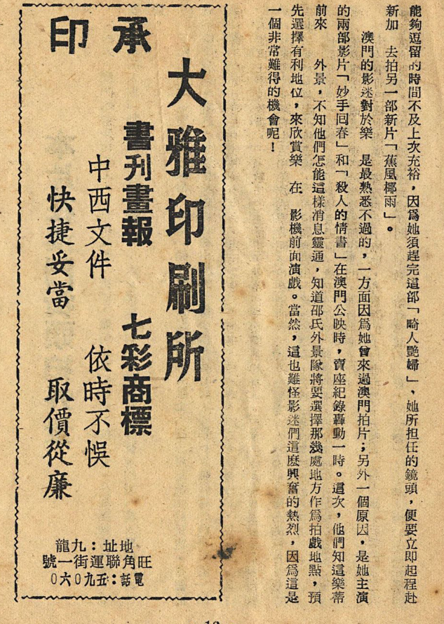 澳門的影迷對於樂蒂是最熱悉不過的,一方面因為她曾來過澳門拍片;另外一個原因,是她主演的兩部影片「妙手回春」和「殺人的情書」在澳門公映時,賣座紀錄轟動一時。這次,他們知道樂蒂要來拍外景,不知他們怎能這樣消息靈通,知道邵氏外景隊將要選擇那幾處地方作為拍戲地點,預先選擇有利地位,來欣賞樂蒂在影機前面演戲。當然,這也難怪影迷們這麼興奮的熱烈,因為這是一個非常難得的機會呢!