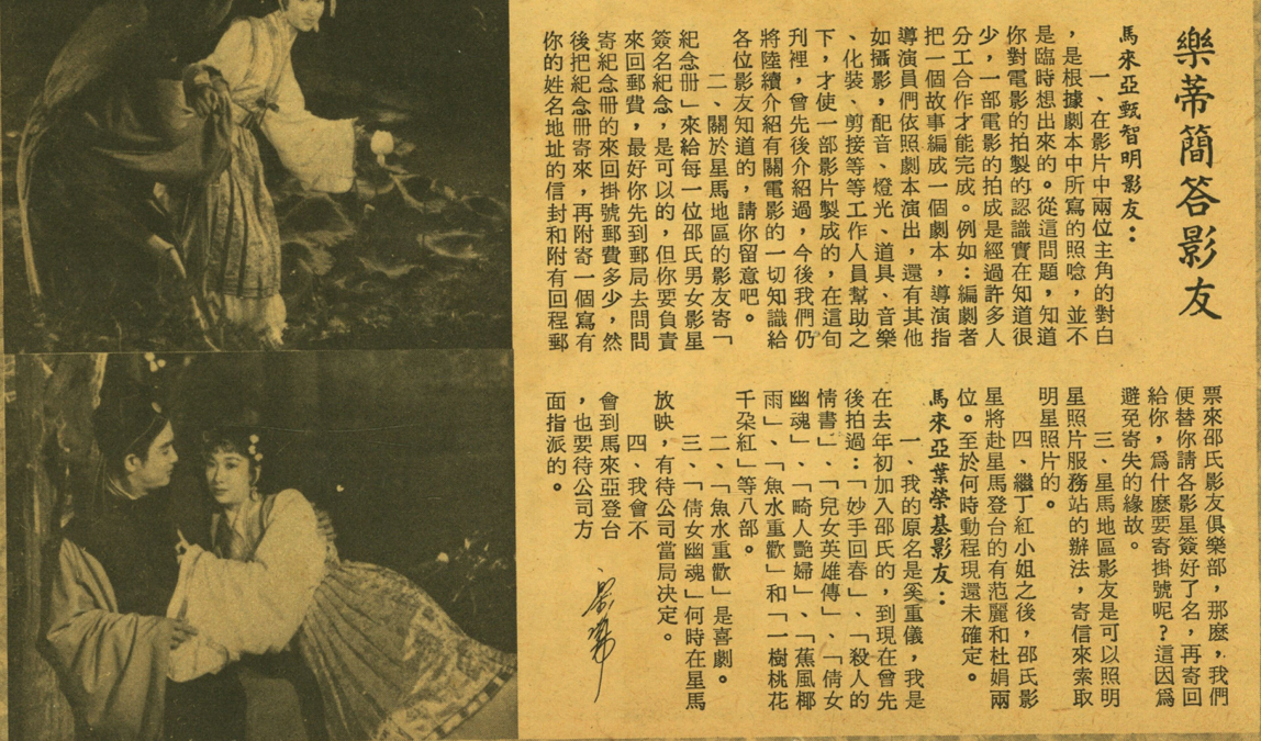 二、關於星馬地區的影友寄一冊「紀念冊」來給每一位邵氏男女影星簽名紀念,是可以的,但你要負責寄回郵費,最好你先到郵局去問問寄纪念册的来回掛號郵費多少,然後把紀念冊寄來,再附寄一个写有你的名字地址的信封和附有回程邮票来邵氏影友俱乐部,那么,我们便替你请各影星签好了名,再寄回给你,为什么要寄挂号呢?这因为避免寄失的缘故。
