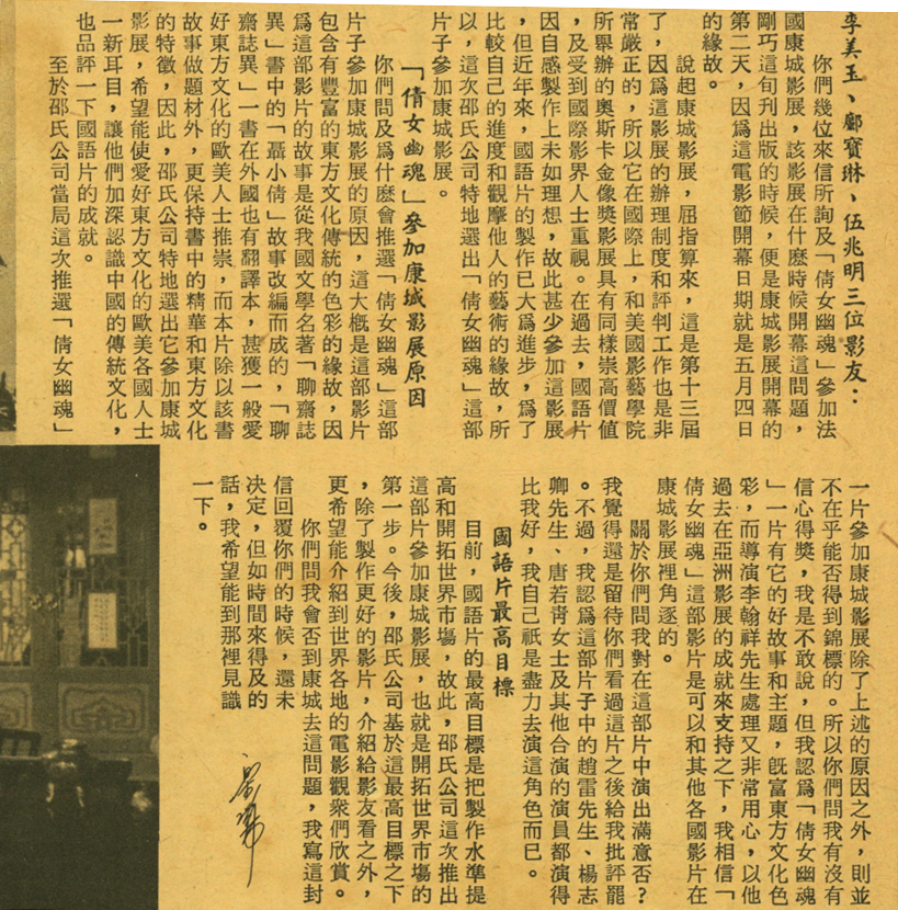 至於邵氏公司當局這次推選「倩女幽魂」一片參加康城影展除了上述的原因之外,則並不在乎能否得到錦標的。所以你們問我有沒有信心得獎,我是不敢說,但我認為「倩女幽魂」一片有它的好故事和主題,既富東方文化色彩,而導演李翰祥先生處理又非常用心,以他過去在亞洲影展的成就來支持之下,我相信「倩女幽魂」這部影片是可以和其他各國影片在康城影展裡角逐的。