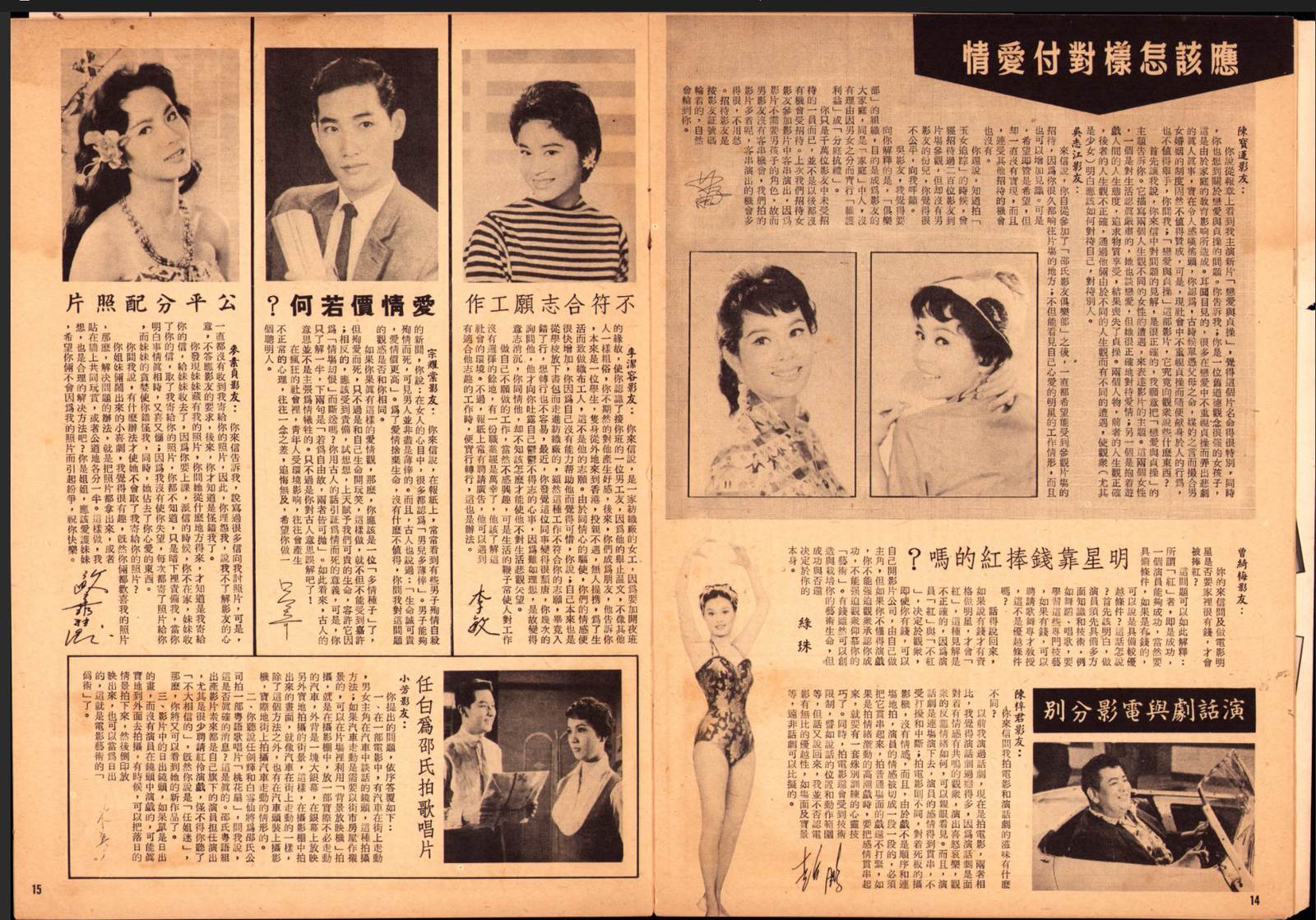 你來信把你的戀愛情形告訴我。並把「畸人艷婦」中的我來比較你的遭遇,其實有點錯誤的,因爲我在「畸人艷婦」片中飾演的冷樹賢是個有夫之婦,她和她的丈夫的表哥趙明在月色和樹下談心那一幕,在冷樹賢心中祇是以表嫂和表叔的關係閒談而已。而冷樹賢並沒有愛上表叔之意,所以當趙明露出愛意要強吻我的時候,我自然要逃走的,這和你與那位同學A君所發生的情形是不相同的。而且身份有別的。不過,當A君向你強吻,而你也掙扎逃走,保持你未婚少女的尊嚴,這樣做是對,所以你問我,你是否太自私,我以爲並不自私,而是一個少女應有的矜持。不過,你說實在愛着A君,用什麼方法挽回過去的愛情這個問題,我也因爲不知道你倆過去的愛情發展到怎樣?所以難以解答。事實上,我也不是戀愛顧問,所以難替你想出善法,祇是照我以爲,你還是保留着看看A君今後對你的態度怎樣來決定罷。