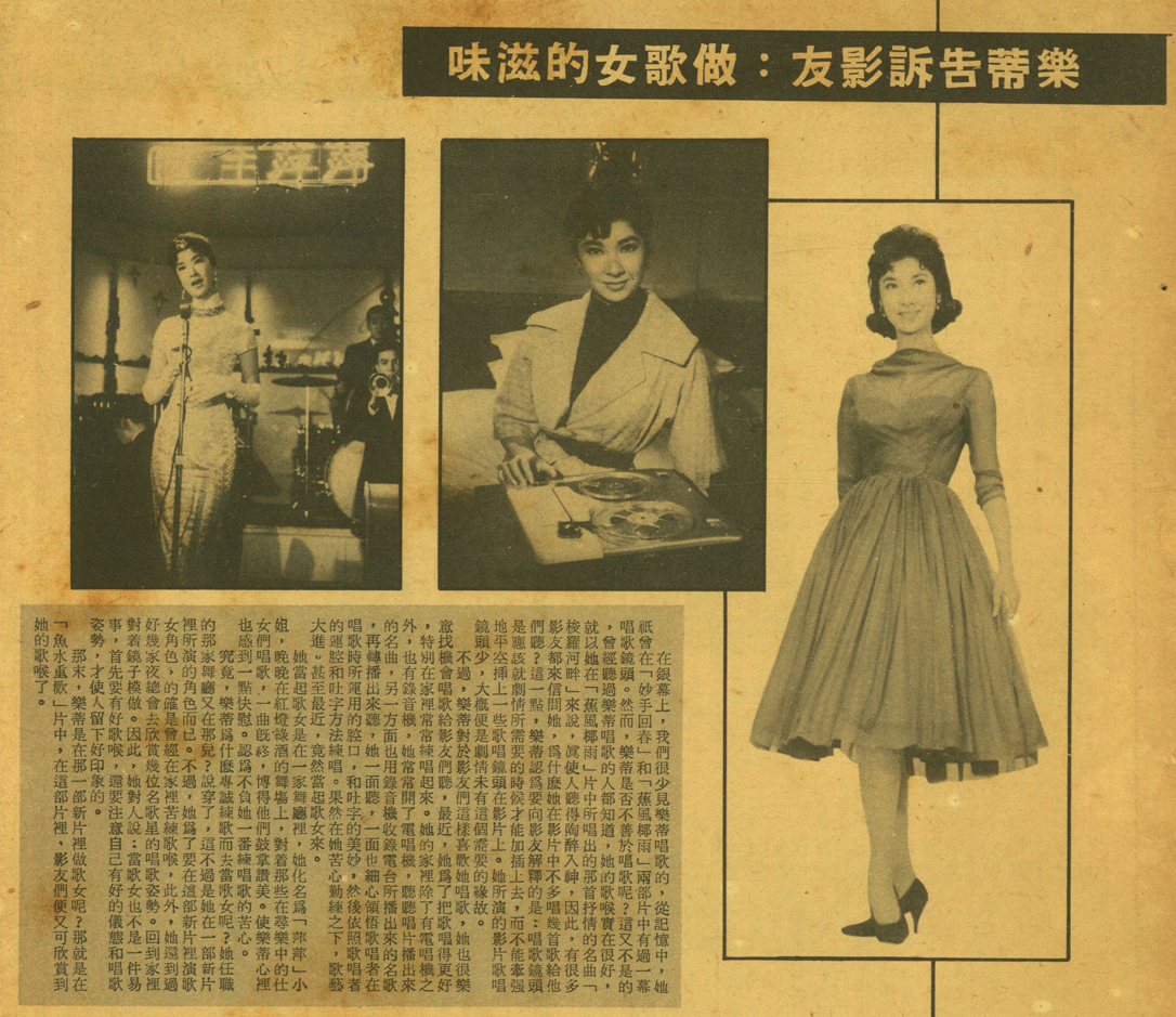 在銀幕上,我們很少見樂蒂唱歌的,從記憶中,她祇曾在「妙手回春」和「蕉風椰雨」兩部片中有過一幕唱歌鏡頭。然而,樂蒂是否不善於唱歌呢?這又不是的。曾經聽過樂蒂唱歌的人都知道,她的歌喉實在是很好,一曲「蕉風椰雨」片中所唱出的那首抒情的名曲——「梭羅河畔」來說,真使人聽得陶醉入神,因此,有很多影友都來信問她,為什麼她在影片中不多唱幾首歌?