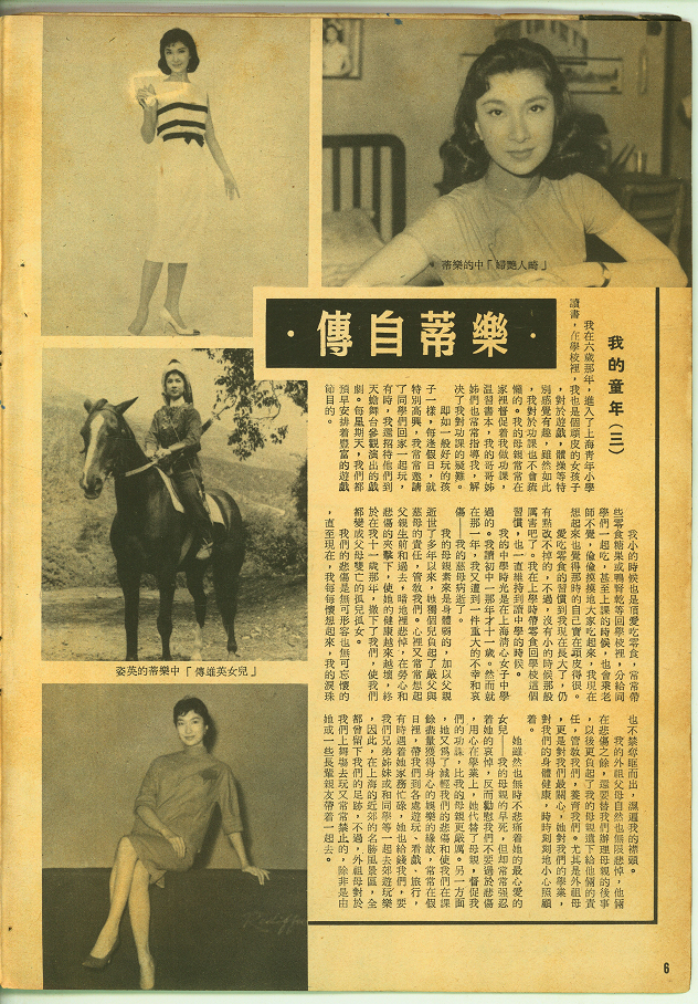 ,對於遊戲,體操等特別感覺有趣,雖然如此,我對於功課也不會疏懶的。我的母親常常在家裡督促着我做功課,溫習書本,我的哥哥姊姊們也常常指導我,解決了我對功課的疑難。即如一般好玩的孩子一樣,每逢假日,就特別高興,我常常邀請了同學們回家一起玩,有時,我還招待他們到天蟾舞台參觀演出的戲劇。每星期天,我們都預早安排着豐富的遊戲節目的。