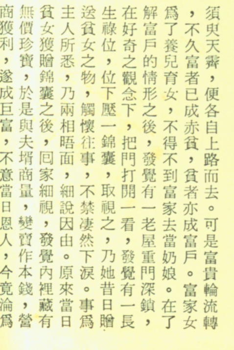 須臾天霽,便各自上路而去。可是富貴輪轉,不久富者已成赤貧,貧者亦成富戶。富家女為了養兒育女,不得不到富家去當奶娘。在了解富戶的情形之後,發覺有一老屋重門深鎖,在好奇之觀念下,把門打開一看,發覺有一長生祿位,位下壓一錦囊,取視之,乃她昔日贈送貧女之物,觸懷往事,不禁淒然下淚。事為主人所悉,乃兩相晤面,細說因由。原來當日貧女獲贈錦囊之後,回家細視,發覺內裡藏有無價珍寶,於是與夫婿商量,變賣作本錢,營商獲利,遂成巨富,不意當日恩人,今竟淪為奶娘,真相大白之後,兩家乃併作一家人。而當日富家女之母,給錦囊女兒,亦是寓有備不時之需之意,不圖乃中途贈與他人,而收今日之果。因囊上綉有麟吐玉書的圖案,故名曰「鎖麟囊」。故事雖不離富貴貧賤的俗套,但比之千篇一律的書生落難,小姐多情贈金的故事,輕鬆得多了。