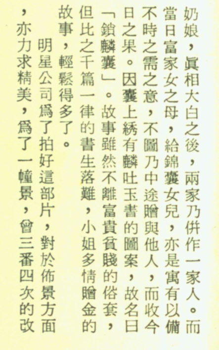 「鎖麟囊」這個刁鑽古怪的名兒,在廣東人看來,確實有點異樣,所以明星公司當時擬改為「如意吉祥」,但後來幾經考慮,認為「如意吉祥」那名字,太過平凡,而且不切實際,因為「鎖麟囊」原是已故京劇名旦程硯秋晚年劇本之一,當年在京滬各地演出,都相當賣座,老一輩的北方人士,對這個名字,是不會陌生的,現在所拍的又是國語片,是以迎合北方人士觀看的,用回「鎖麟囊」這個名字,還可能收賣座之效吧!