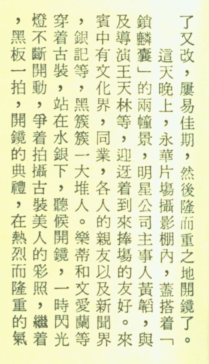 明星公司為了拍好這部片,對於佈景方面亦力求精美,為了一幢景,曾三番四次的改了又改,屢易佳期,然後隆重之地開鏡了。這天晚上,永華片場攝影棚內,蓋搭着「鎖麟囊」的兩幢景,明星公司主事人黃韜,與及導演王天林等,迎迓着到來捧場的友好。來賓中有文化界,同業,各人的親友以及新聞界,銀記等,黑簇簇一大堆人。樂蒂和文愛蘭等穿着古裝,站在水銀下,聽候開鏡,一時閃光燈不斷開動,爭着拍攝古裝美人的彩照,繼着,黑板一拍,開鏡的典禮,在熱而隆重的氣氛中完成了。