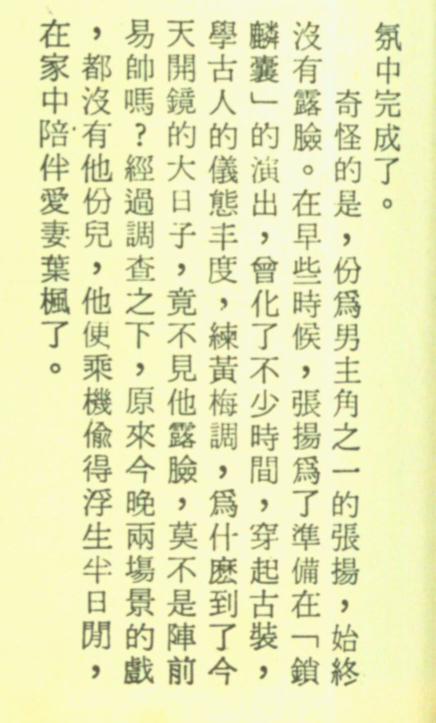 奇怪的是,份為男主角之一的張揚,始終沒有露臉。在早些時候,張揚為了準備在「鎖麟囊」的演出,曾化了不少時間,穿起古裝,學古人的儀態豐度,練黃梅調,為什麼到了今天開鏡的大日子,竟不見他露臉,莫不是陣前易帥嗎?經過調查之下,原來今晚兩場景的戲,都沒有他份兒,他便乘機偷得浮生半日閒,在家中陪伴愛妻葉楓了。