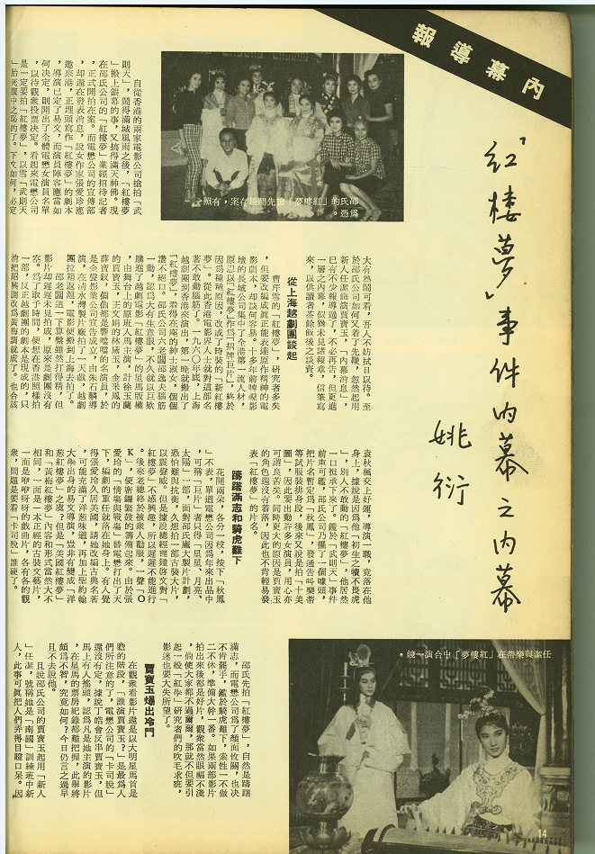 自從香港的兩家電影公司搶拍「武則天」,鬧得滿城風雨之後,「紅樓夢」搬上銀幕的事,又搞得滿天神佛。現在邵氏公司的「紅樓夢」業經招待記者,正式開拍在案。而電懋公司的宣傳部,卻還在發表消息,說女作家張愛玲應邀來港,正埋頭寫作「紅樓夢」的劇本,導演已定了易文,而演員陣容應當如何決定,則開出了全體電懋女演員名單,以待觀衆投票決定。看起來電懋公司是一定要拍「紅樓夢」,以雪「武則天」一胎死腹中之恥的了。下文如何,必定大有熱鬧可看,吾人不妨拭目以待。至於邵氏公司如何又着了先鞭,忽然起用新人任潔飾演賈寶玉,「內幕消息」,已有不少報導過了,不必再告,但更進一層之內幕,似猶未見諸報章,信筆寫來,以供讀者茶餘飯後之談資。