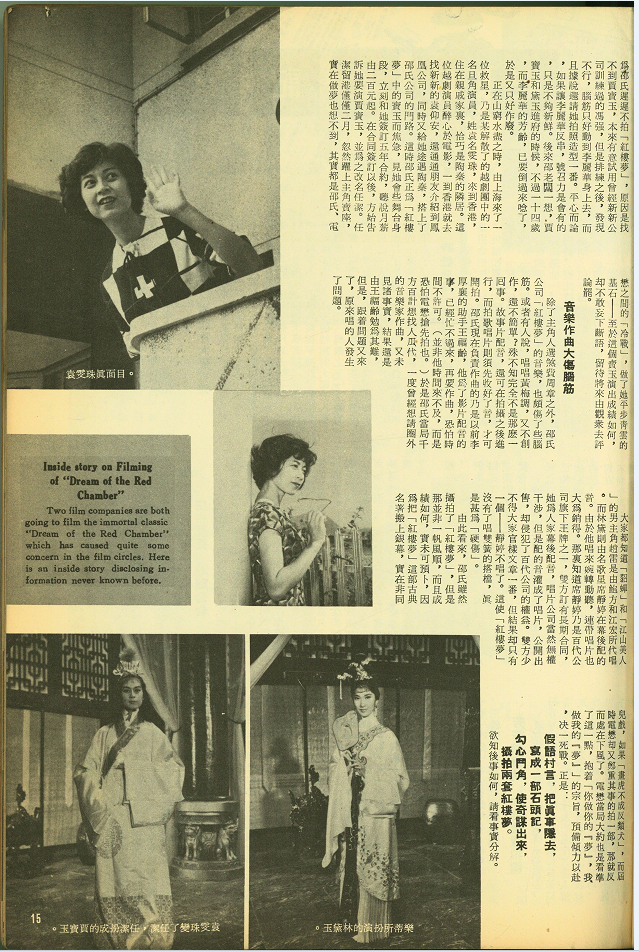 邵老闆這一下算盤雖然打得精,但影片卻遲遲未見拍成,原來是劇團沒有空。為了取予時間,便想在香港照樣拍一部,反正越劇團的劇本是現成的,只消把紹興調改為黃梅調就成了。也合該袁秋楓交上好運,導演一職,竟落在他身上,據說是因爲他「初生之犢不畏虎」,別人不敢動的「紅樓夢」,他居然一口担保下來了。鑑於「武則天」事件前車可鑑,邵氏公司乃擺了一個噱頭,把片名暫定為「秋鳳」,發通告叫樂蒂等試服裝排身段,後來又說是拍「十美圖」,因此要出動許多女演員,用心亦可謂良苦矣。同時更大的原因是賈寶玉的角色還沒有着落,因此也不肯輕易發表「紅樓夢」的片名。