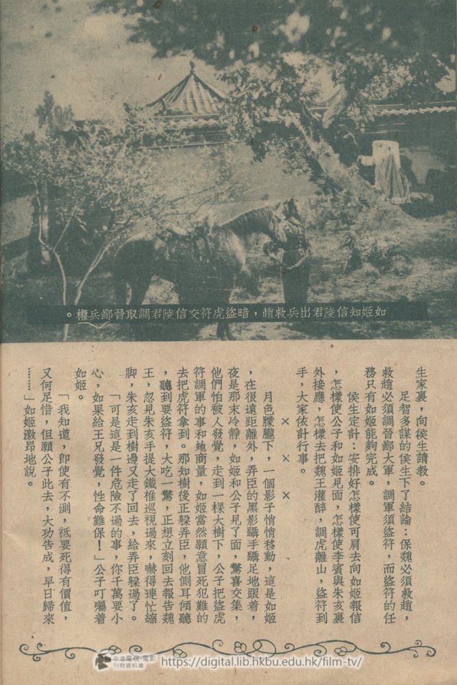 「誰在說話?」信陵君驚奇的問,想不到這幾句話,竟出自一個年輕的女孩子的口裏,她就是如姬,從趙國逃難出來,在夷門城下,紿侯生收爲義女,信陵君抬頭一望,祇見她容貌端麗,情態温文,乃是一位絶代佳人,他請侯生召如姬來共談國事,並且問起趙國被圍的情形,和她的身世,如姬回述往事,瀝瀝如在眼前,不禁悽然淚下。