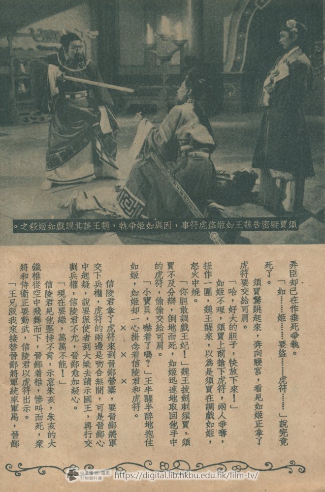「你胆敢調戲王妃!」魏王拔劍刺須賈,須賈不及分辯,倒地而死,如姬迅速地取回他手中的虎符,偷偷交給可肩。